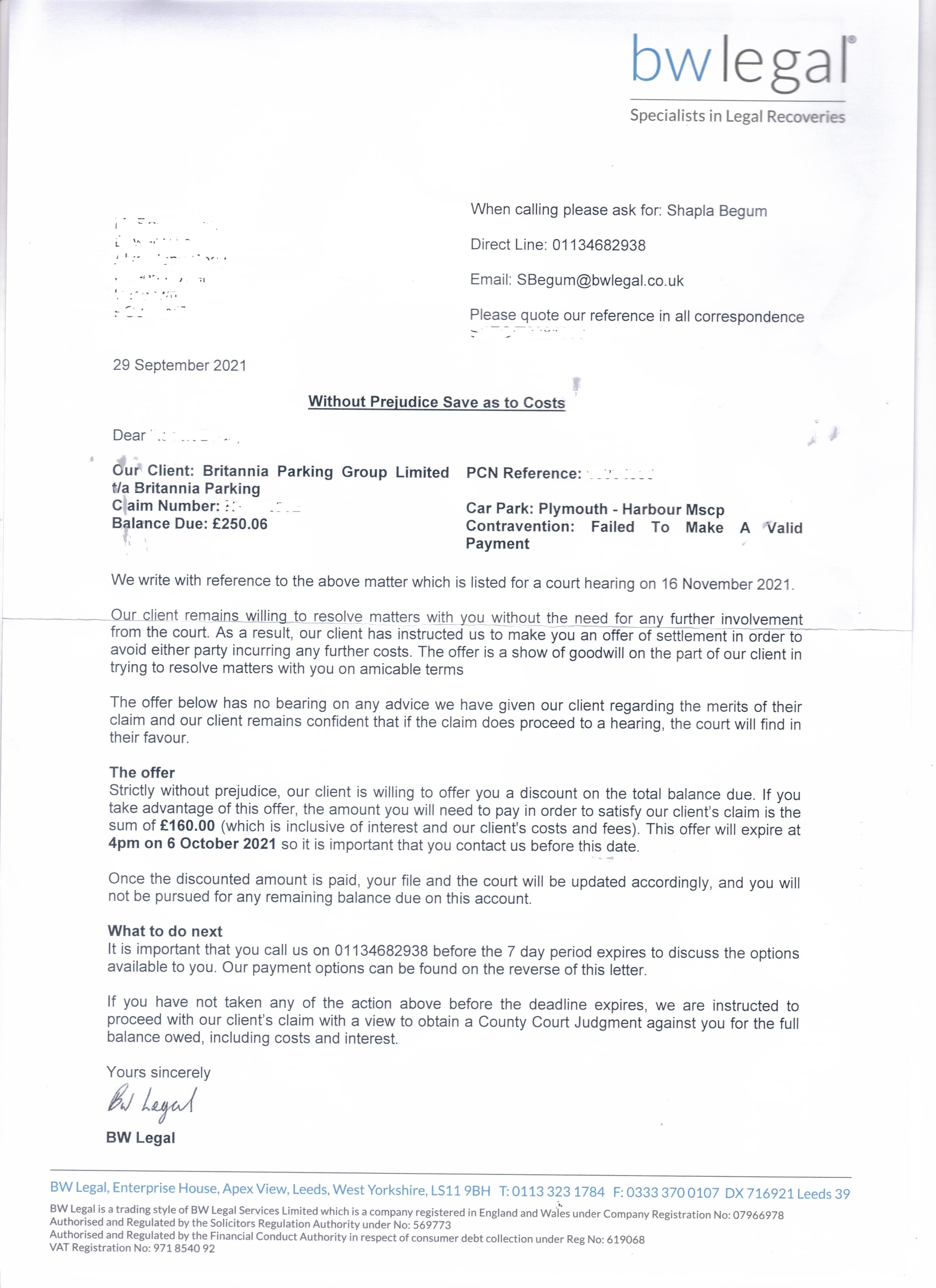 Hello again,A somewhat bewildered man in a wheelchair here, awaiting major back operation totally out of the blue on 22nd of this month, and thought i might keep my mind busy/occupied with one of my parking ticket situations. This being the latest redirected letter from B W Legal (why do i always associate these *~}+=(*&%&* with that unnerving buzzing sound you get around your ear in Summer, knowing something not good is on it's way) Sorry, waffling . . .They still send correspondence to our old address after repeatedly informing them we moved a long time ago, hence letter i received this afternoon looks like i have been somewhat lax in my response, one thing is for sure, with what has been happening to me in these past few months, these characters are quickly taking a back seat.I have only put this on for information/interest of anyone else who may have come across a similar letter/situation. I did find a few from Googling a similar site as MSE, and most had different outcomes, so i didn't really glean much information from any of them . . .I guess they will all be under different circumstances.Wasn't sure if these letters/offers were just pumped out by the hundreds as a hearing/court time approaches, or they think maybe get a % and walk away . . . possibly?Thanks once more . . .