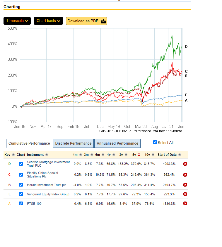 Another factor is the graphs. In your graph the companies appear to follow each other particularly closely because by adding SMT you have squeezed the funds you are looking at into less than half the graph. Also, because the scale is linear, if a fund doubles in size in each of two successive years the increase in the graph in the second year is twice that in the first year: £100 grows to £200 shown as 0%-100% return, followed by £200 growing to £400 shown as 100-300% return. The effect over the long term is that major variations in the early years can be compressed nearly out of existance.4