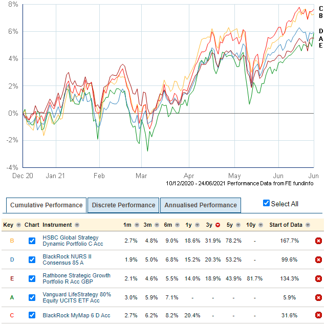 I've done a Trustnet chart comparison of the main "consumer friendly" multi-asset funds. These are for the higher risk portfolio (80-90% equity) options in each - and compared them to Rathbone multi-asset. This is over a 1 year span. For some reason LifeStrategy 80% only has history for 1 year and MyMap has only been on the scene for 2 years I think.