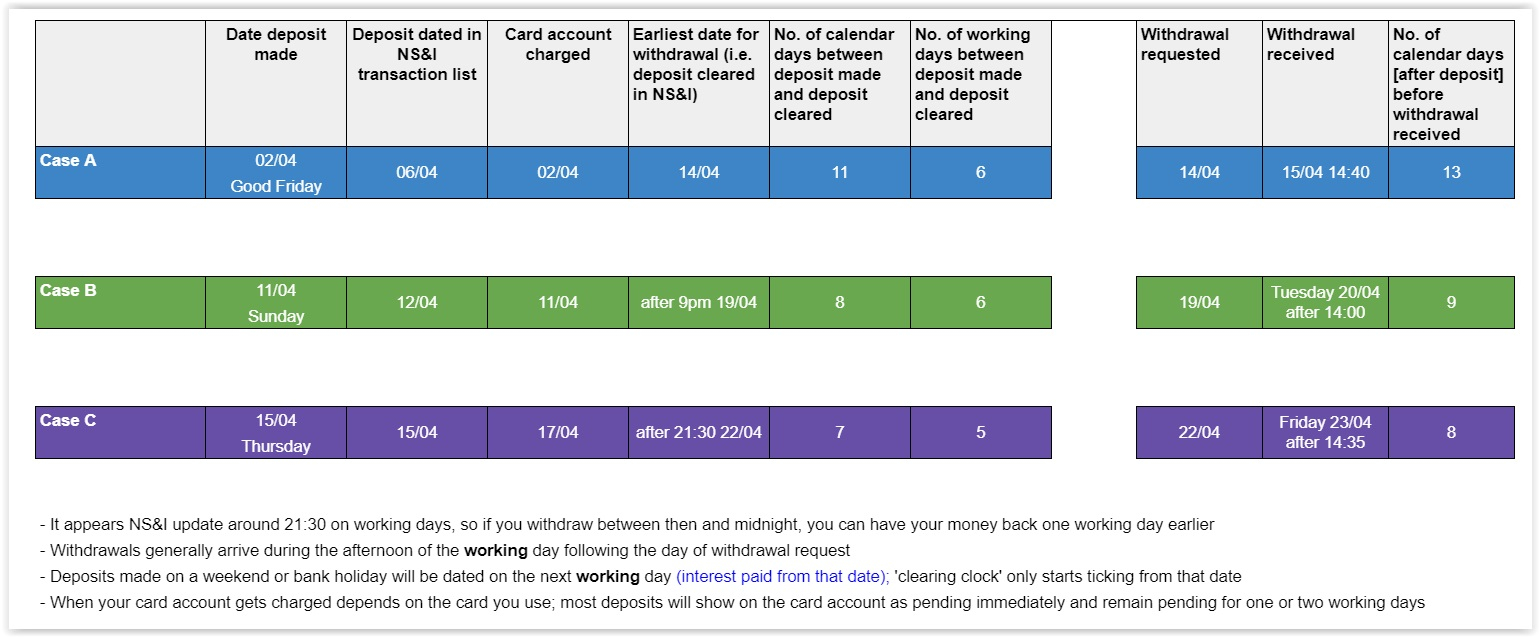 It takes up to 7 working days for a debit card deposit to clear into the NS&I Direct Saver and to become withdrawable.