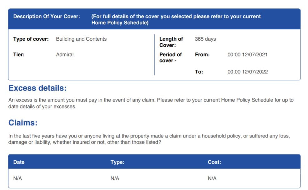 We’d like to get the new policy sorted today (Sunday) but can’t contact Admiral as they are closed, bless them. We’ve searched through all the policy documents online and the only reference to ‘claims’ is in the ‘Home Proposal Confirmation’ as per pic below.