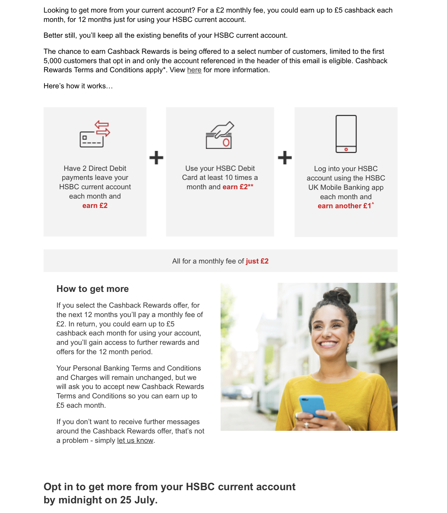 I only found out about the offer when I received a text message from HSBC a couple of hours after they sent the original email (most of my emails are sorted and put into folders automatically and skip the inbox altogether).