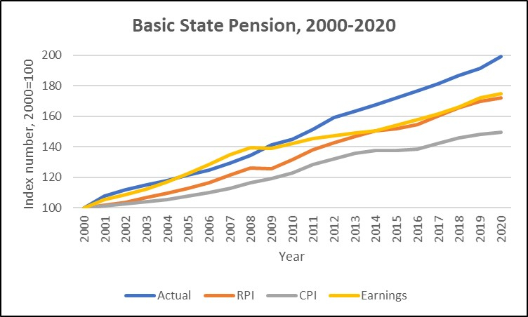 Out of idle curiosity, I charted what the Basic State Pension would have been had it increased in line with various indices since 2000.Prior to 2000, it was increased by RPI for a long time (from the early 1980s), with only a slightly larger increase in a single year (an extra 50p to compensate for VAT being added to fuel).17