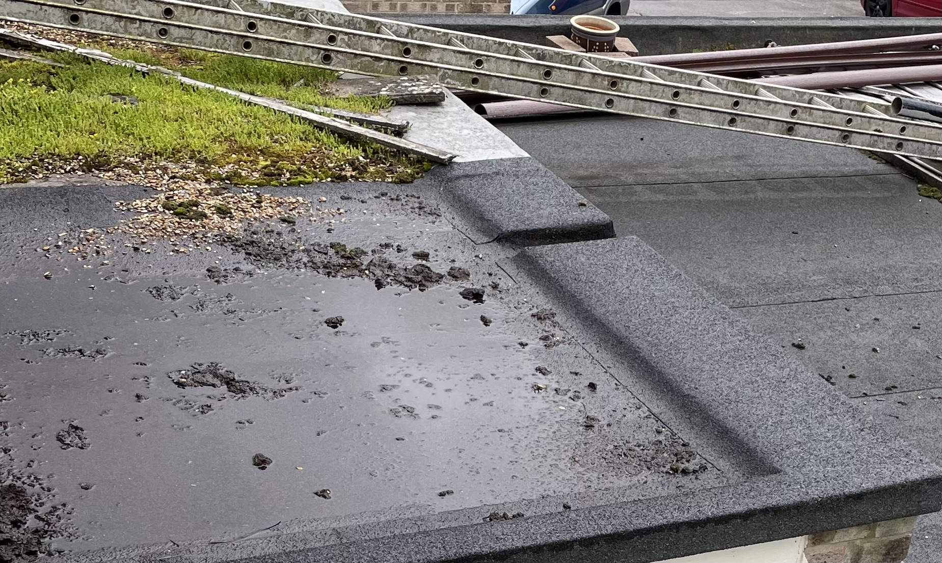 The water pooling on the porch roof is recent rain ( last night ) with the additional water from the neighbours downpipe.