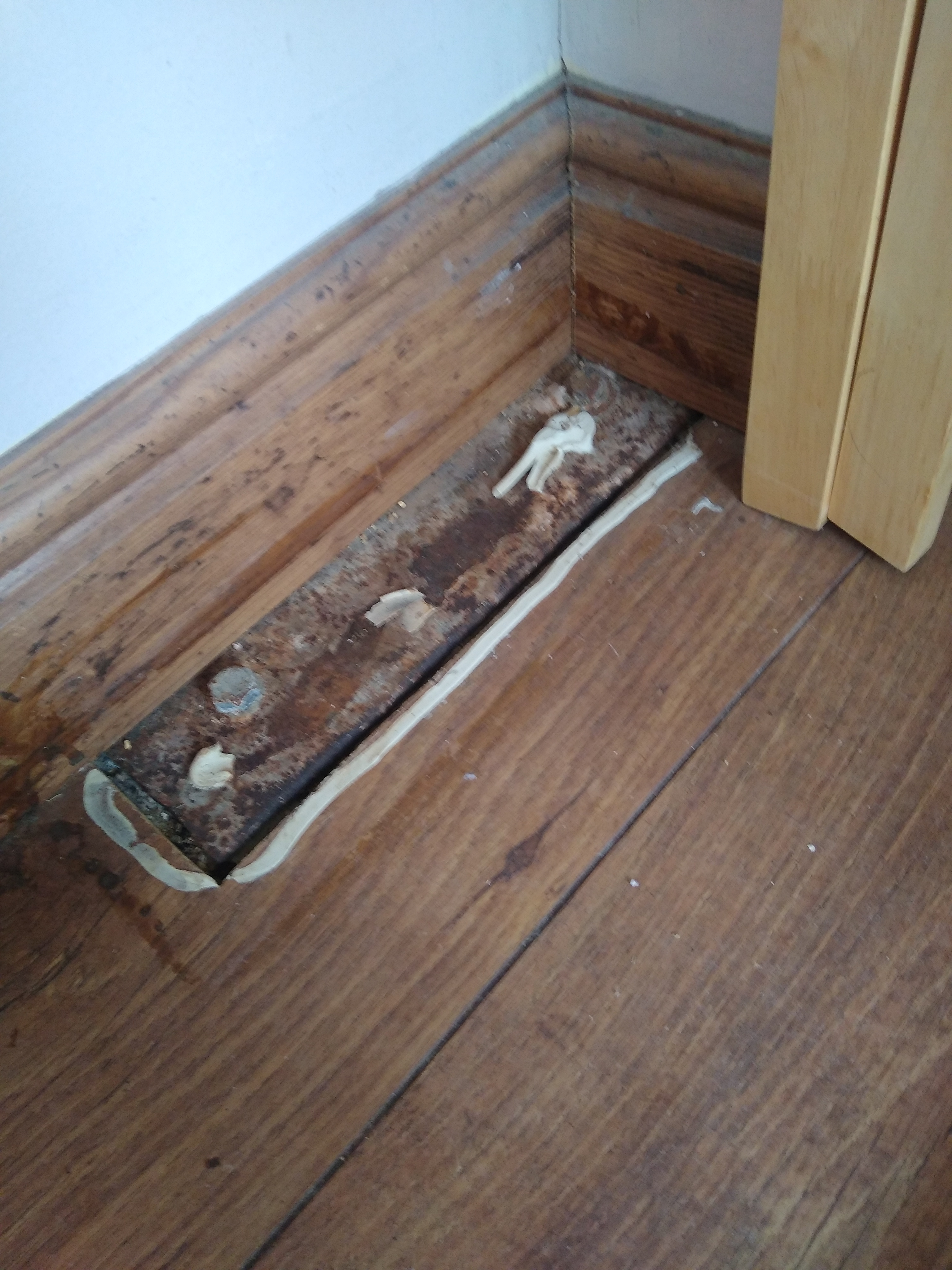 I have these metal plates in the floor either side of an internal wall. These have been here since I bought the house a few years ago and haven't caused a problem until now. I think the walls in my house were repositioned or changed from the original layout at some point. Does anyone know what this plate might be for and is it structural? It's causing me a problem as it's also in my super tiny kitchen and it's in the way of having a full size fridge (currently have a slim line one). The fridge would be uneven with the plate panel underneath on side