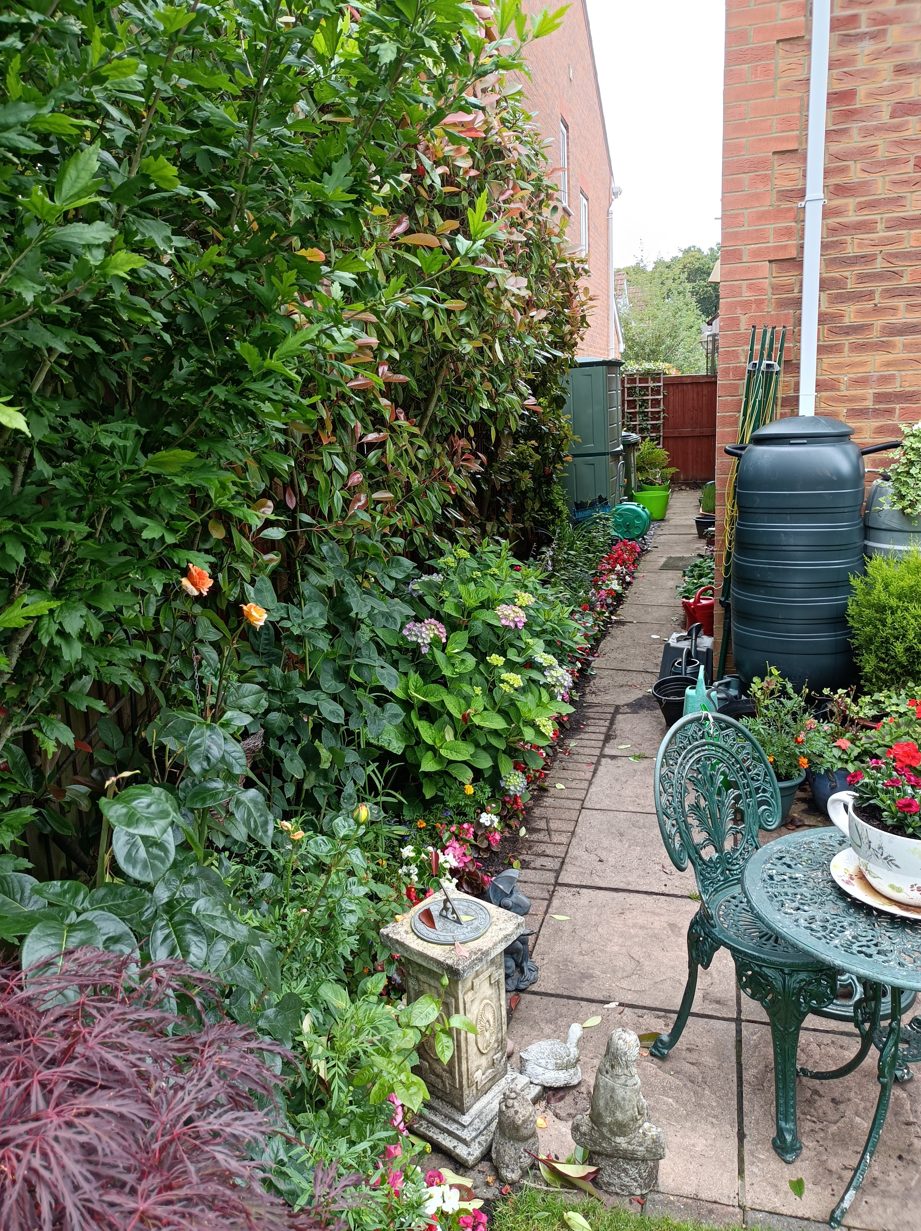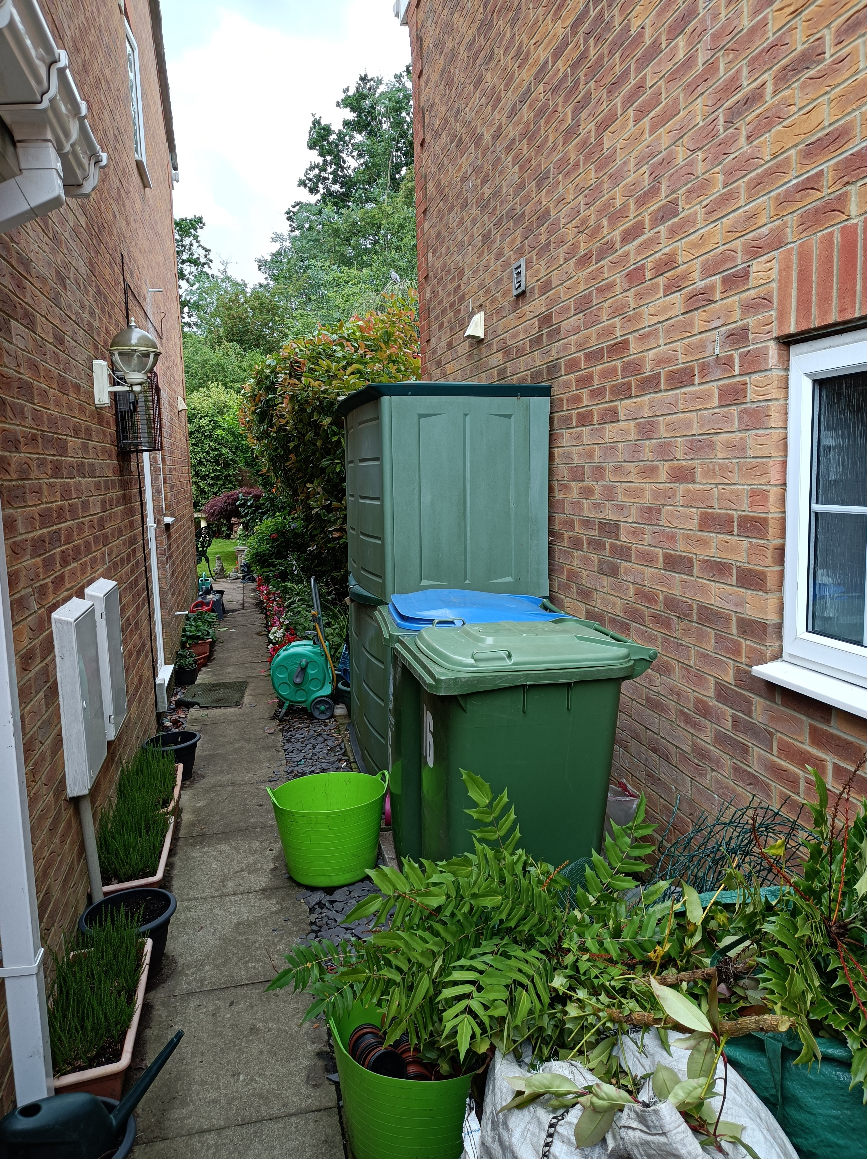 So the neighbours conservatory isn’t going to affect any of the land on the side, surely it’s just being built at the rear of the neighbours house?All those bins and storage belong to your Mum?