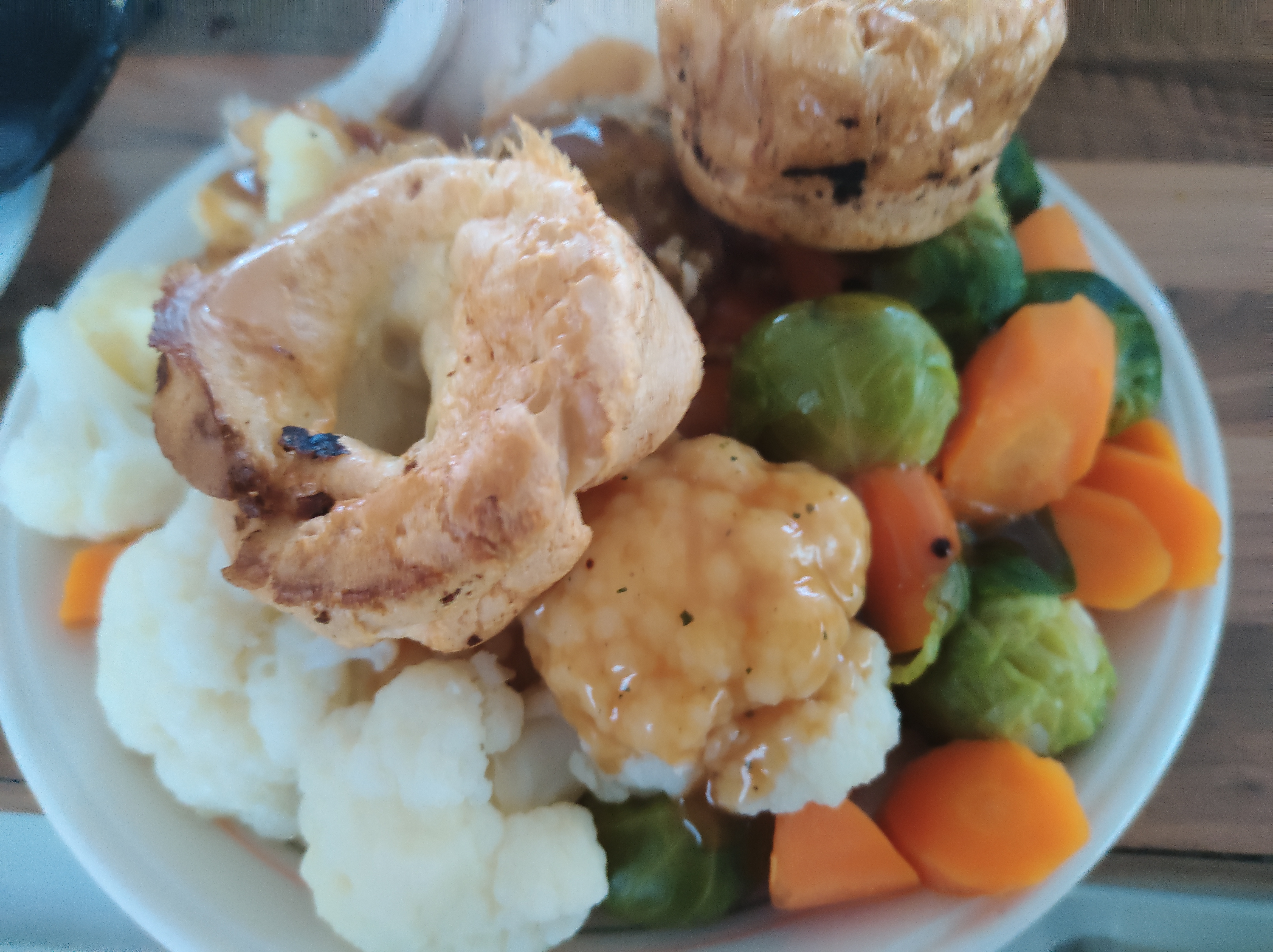 Tea, roast chicken, spoonful mash, carrots, brussels and cauli. Stuffing 2 syns, gravy 4 syns and yorkies 2 syns