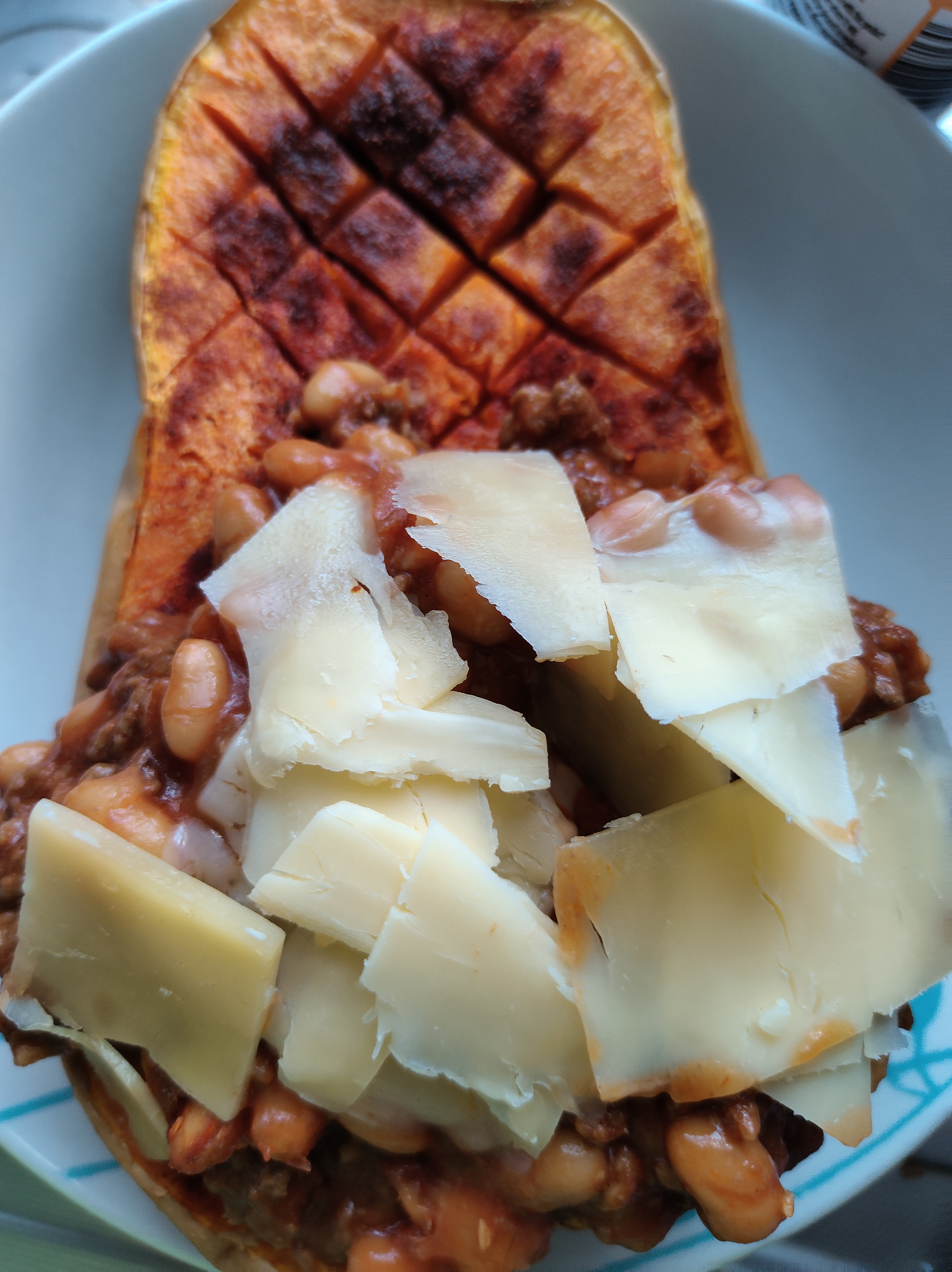 Lunch the other half of bns with the left over spag bol and there was a spoonful of beans left last night so mixed them in , 15 g cheese , part hexa