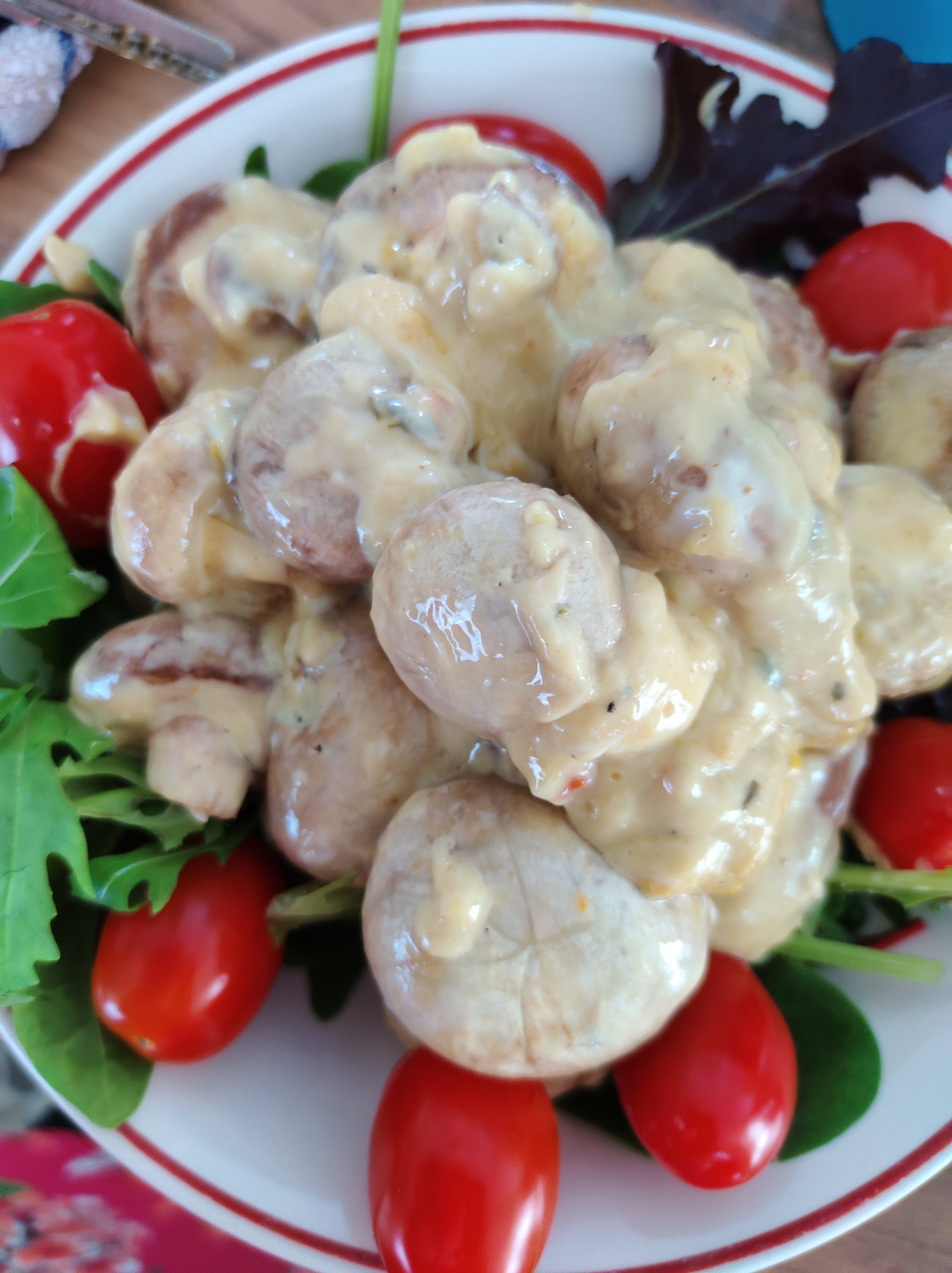 Lunch cheesy garlic mushrooms on a bed of leaves and baby plum toms,