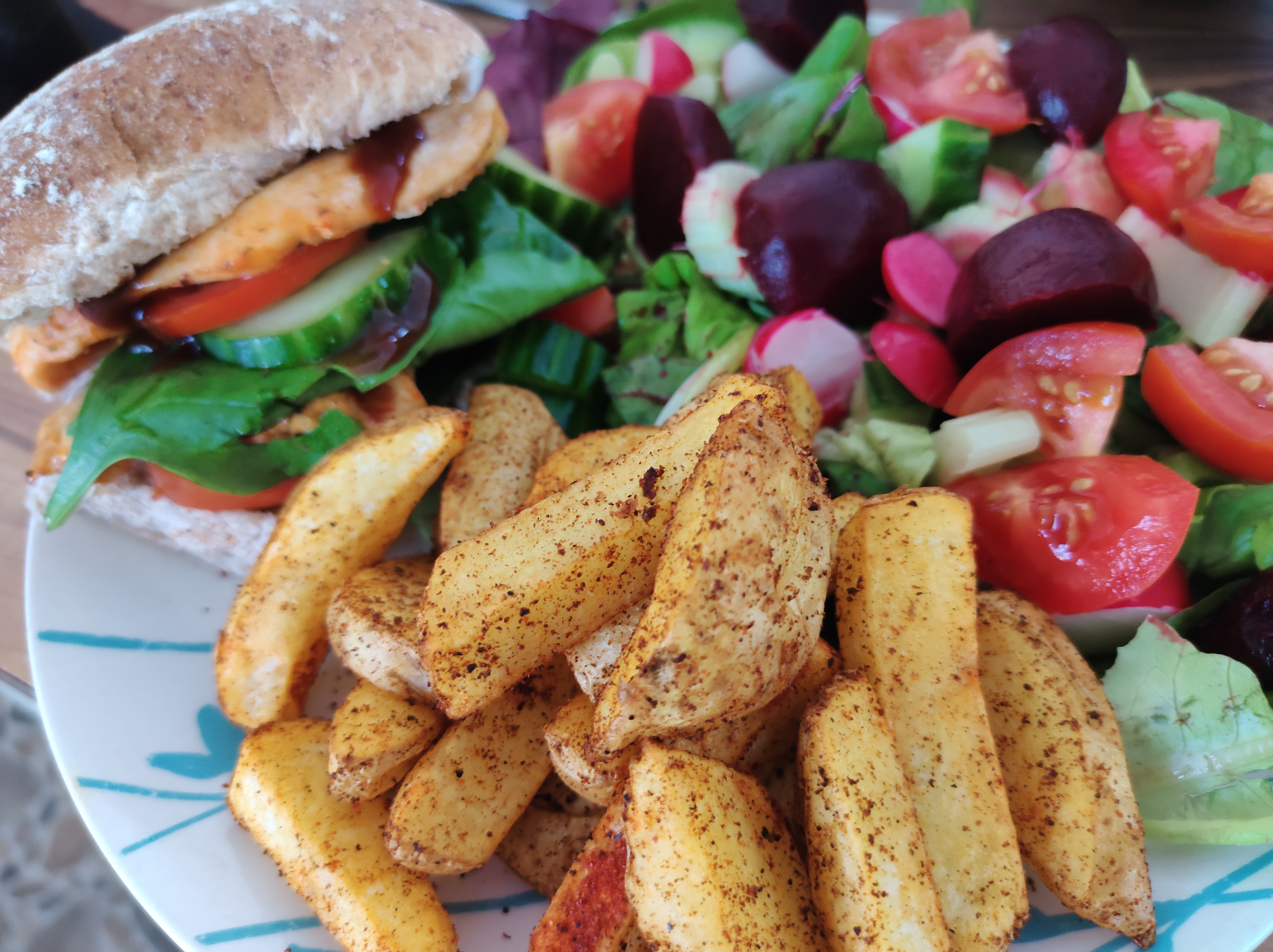 D - chicken & peppers in tomato sauce; mash - P; S; F