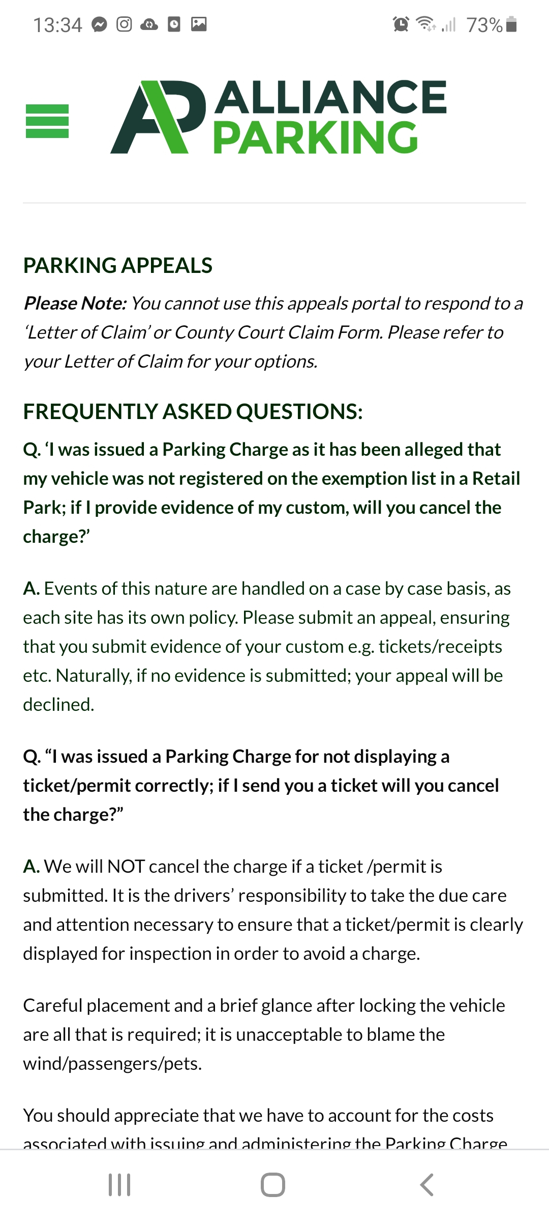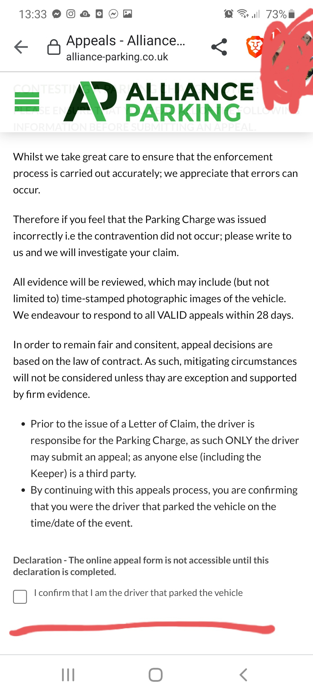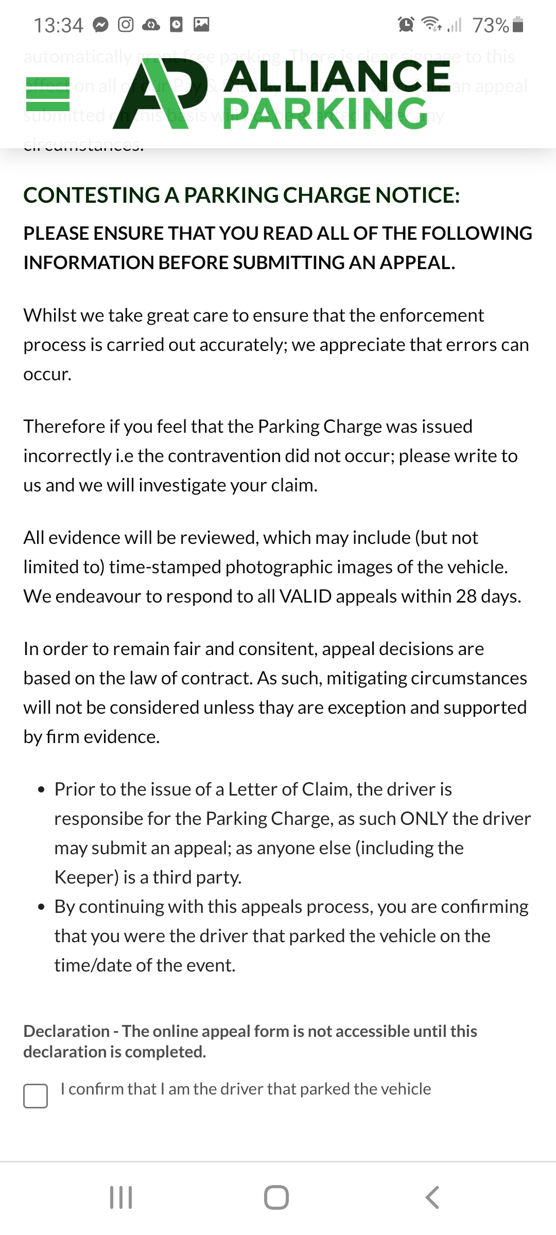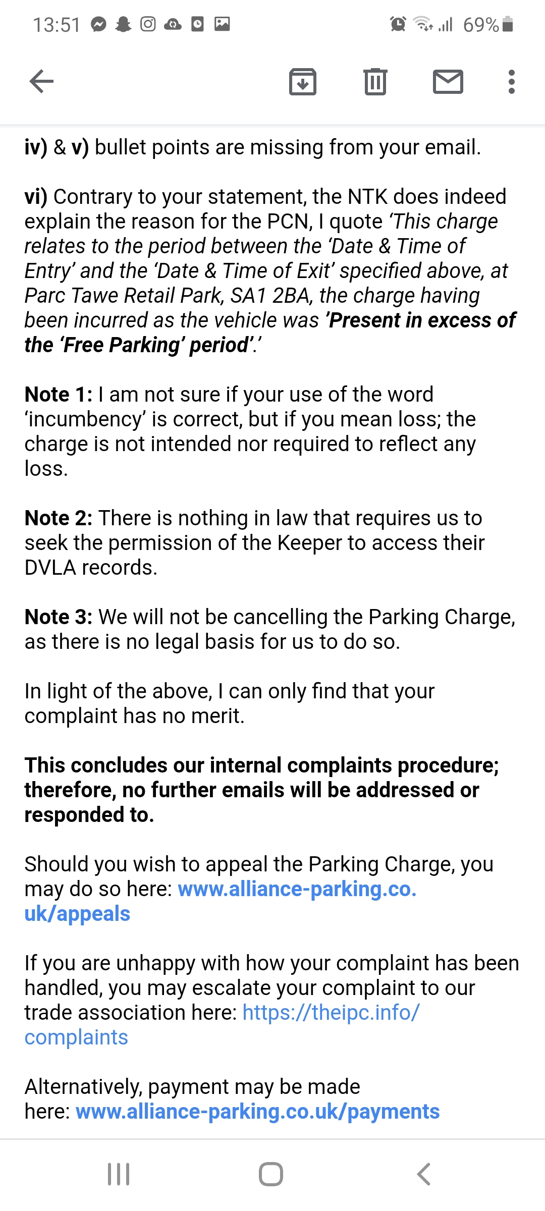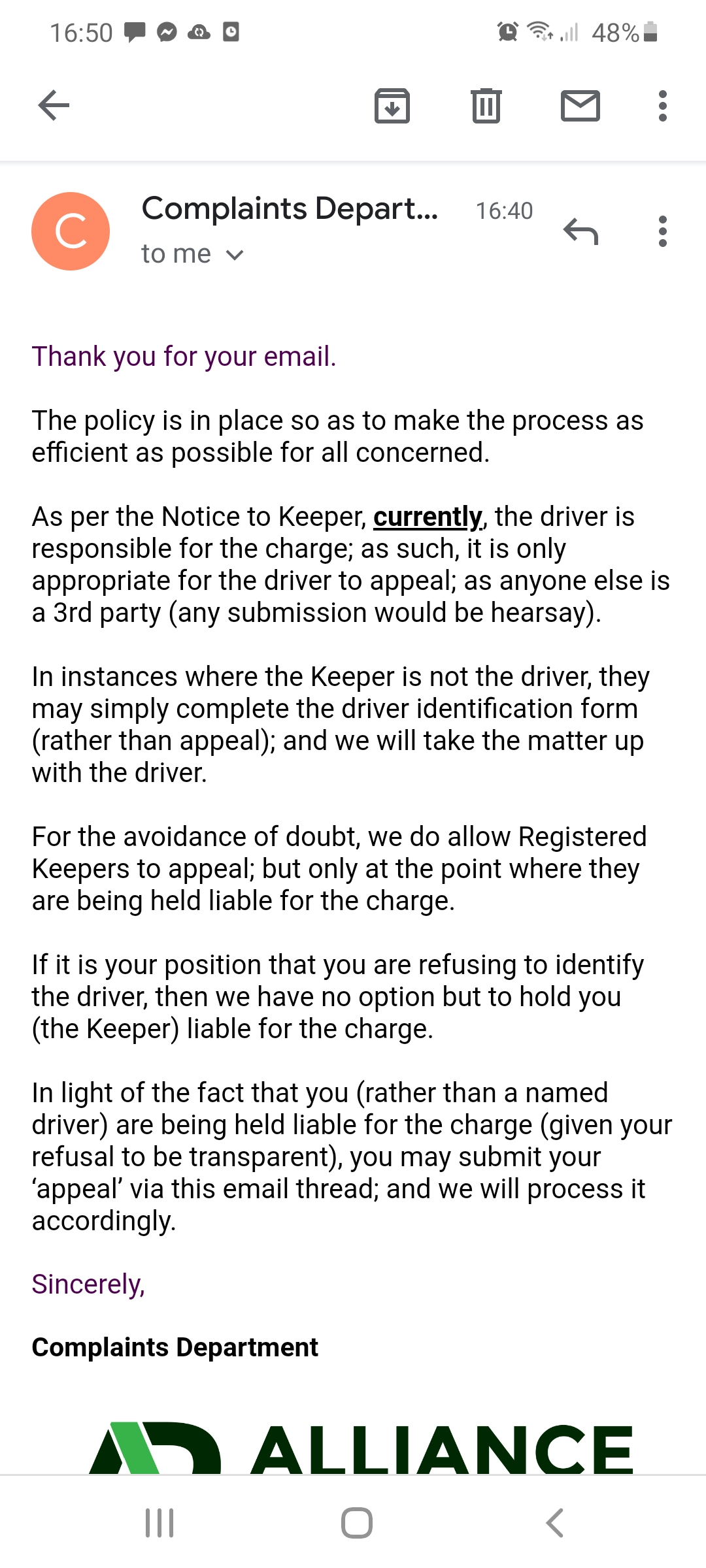 I received a very arrogant response to a complaint made to Alliance Parking, which only serves to make me enjoy refuting them more. There has been a recent and very sly change in ownership of a carpark which has subjected large amount of the public being caught in these disgusting charges. They even have the arrogance to only allow appeals if you confirm you are the driver, utter disgrace of a company. Obviously, having failed to make them see that I have experience dealing with these ludicrous charges, as they have declined to cancel and now refuse further correspondence, and now I cannot even appeal as the appeal process will not allow me to appeal without liability being laid, I have no choice but to go through the drawn out process of getting all the way up to court before they inevitably cancel my charge again.  If there is any further advice I can seek as it had been a while since I have had a parking charge and never one this blatantly disrespectful, I will be happy to hear it.