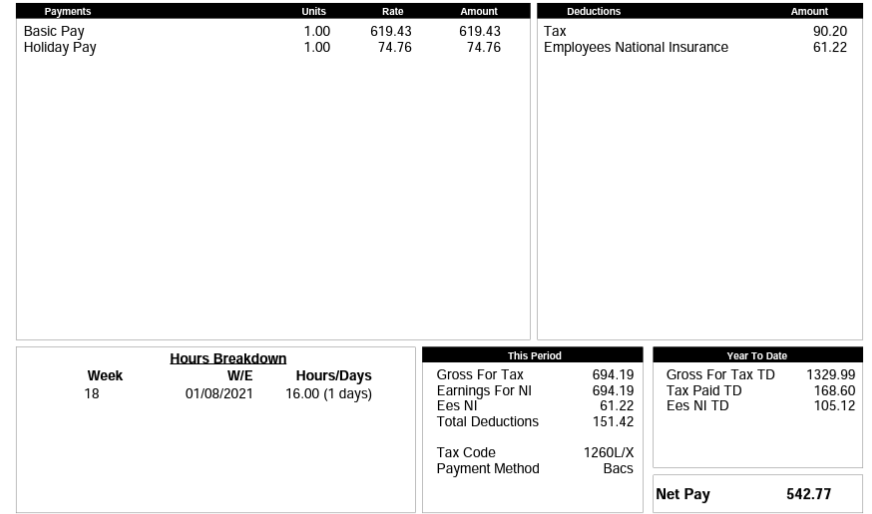 So outside of the £16 all other deductions go to the tax man unless the OP decides to not opt out of the pension or decides they want paid holiday in which case an accrual for that will be held (there is no "use it or lose it though, if they don't use it then it gets paid to them at year end).1 -