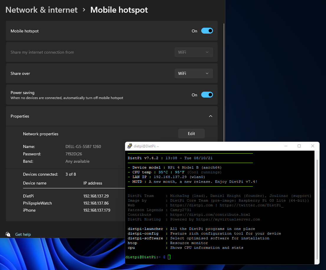 - Connect to your RPI as you normally do and add a new network to its Wi-Fi which matches all the details on the Windows Mobile Hotspot screen.