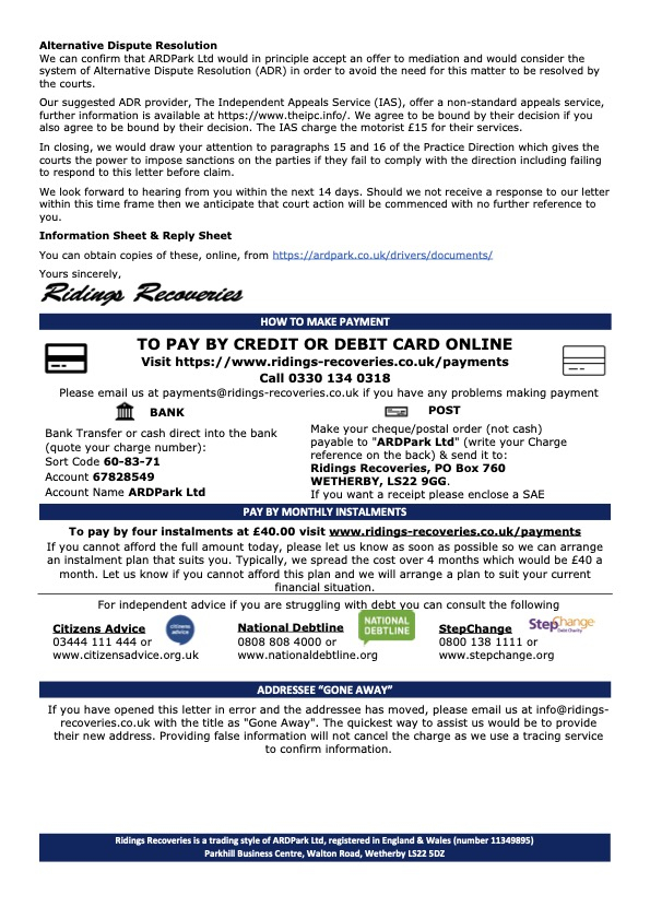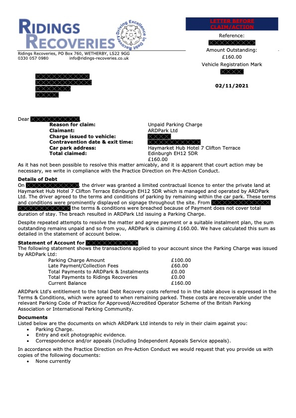 Any help would be appreciatedNo. LBC is not valid in Scotland as these can't be pursued through English County Court as the matter is out of jurisdiction so Pre Action Protocols are also irrelevant. It needs to be pursued through Sheriff Court using Simple Procedure but, as others have pointed out, Scottish Courts actively discourage trivial claims under £300 clogging up courts by requiring payment up front to start the claim and service of document on the person but disallowing all additional costs. So this won't go anywhere near court, whatever Ardpark think as they'll be out of pocket about £100-120 plus solicitors costs to prepare documents for a £100 PCN and no prospect of getting that back in costs.