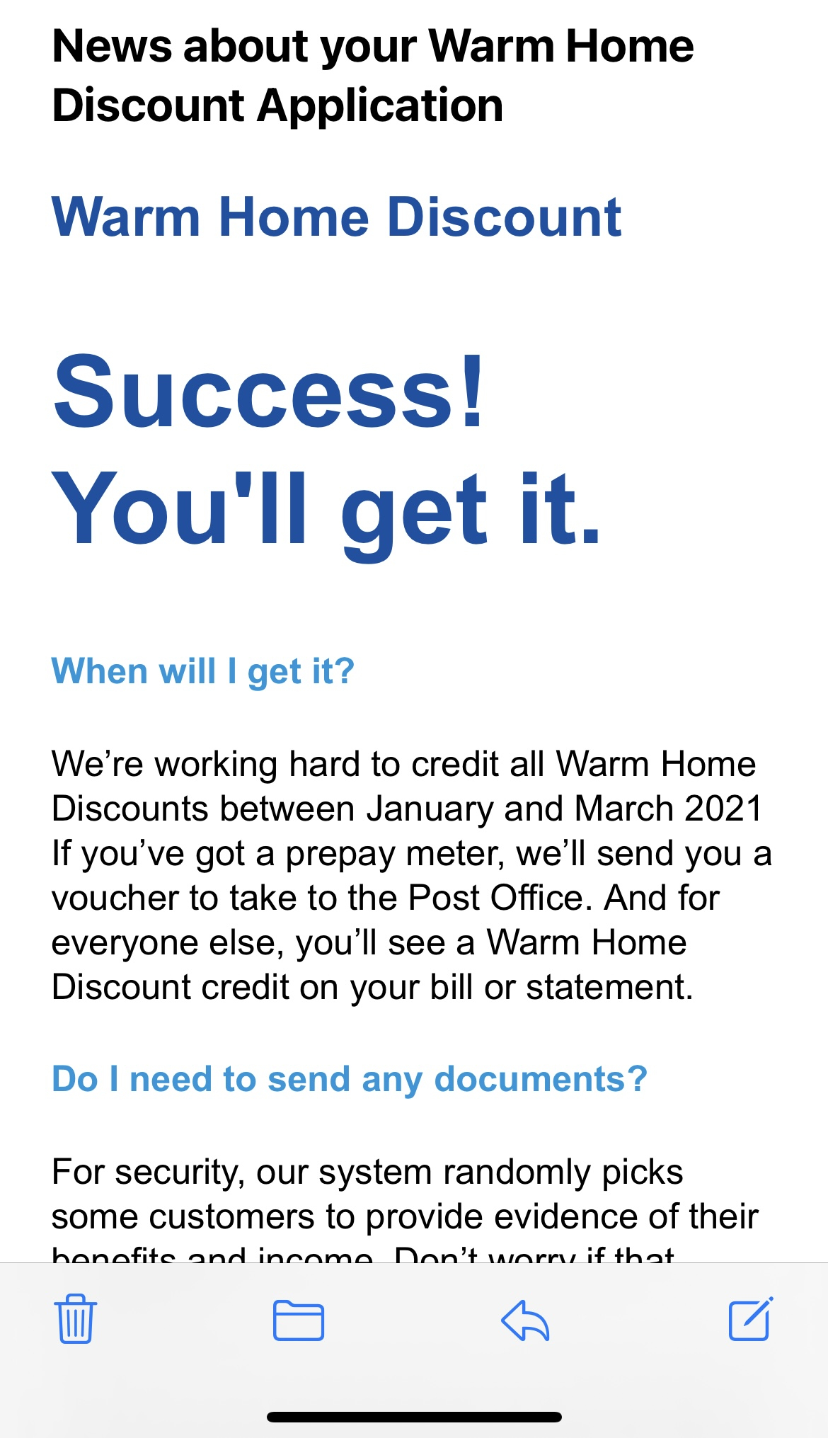 A bit if background. January this year I applied for the warm home discount through British Gas, in the week that followed I received 2 emails, I saying my application has been successfully submitted, then another saying SUCCESS YOU WILL GET IT. Followed by dates I will get it by and a reference number to "keep for my records". Fast forward 6 months. I have chased British Gas for this several times and this morning after another long wait on the phone I was told that there are 3 steps to claiming the warm home discount. 1-apply online, 2-get an email saying your application was successful and you will get it, 3- if your 'chosen' by British Gas you will be sent a letter by end of March, as I didn't get the letter it means I wasn't 'chosen'. Has anyone else had experience like this?