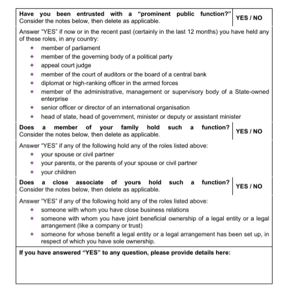 These are the questions I was asked:coffeehound said:I’ll ask, then: What constitutes a Politically Exposed Person?