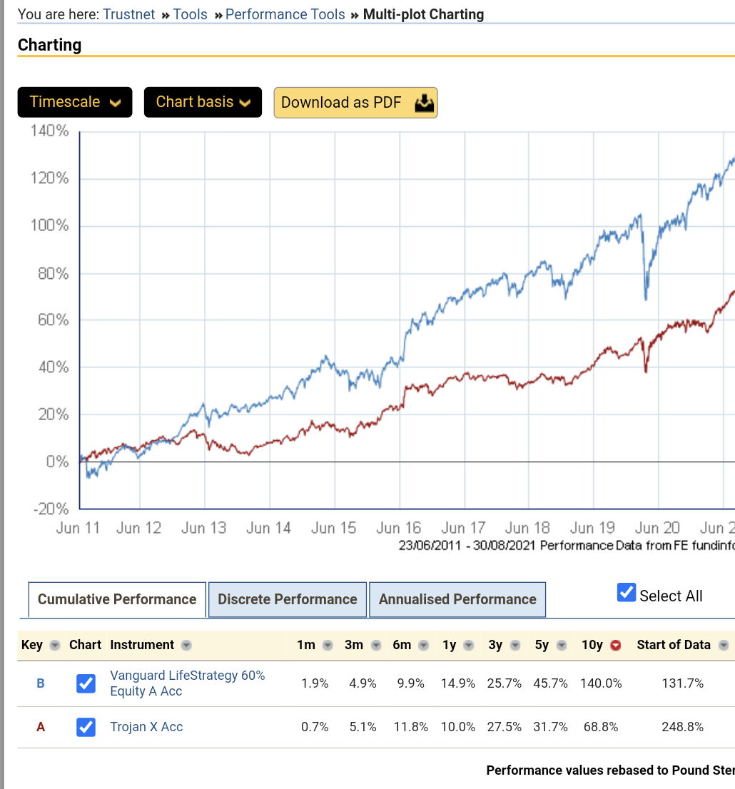 No, because that tells you nothing about the fund. You're thinking about investing backwards based on other people's opinions and how it has behaved. Start with thinking what you want, ie "Safe" and "modest return", over what timescale, what is the maximum drawdown (fall) you would like to see, would you be happy just to keep up with inflation or do you really want a return of inflation plus a few % ideally. Troy Trojan is global 60/40 equity/bonds portfolio marketed as a total return fund - it tries to make sure that if you hold for at least 3 years you'll have a positive return. Since 2011 VLS60, the closest index-based comparator I could think of (plenty others available: https://monevator.com/passive-fund-of-funds-the-rivals/) has outperformed Troy Trojan, but with more volatility. Troy Trojan has looked very good for minimising drawdown, so perhaps it has a place in your portfolio, however using it as your only holding may not be sensible, especially if you need this money to last for retirement and want for it to grow a fair bit over that timeframe.Tommohawk said:Hi all. Folks have been so helpful with my previous posts I'm going to push my luck and try another!