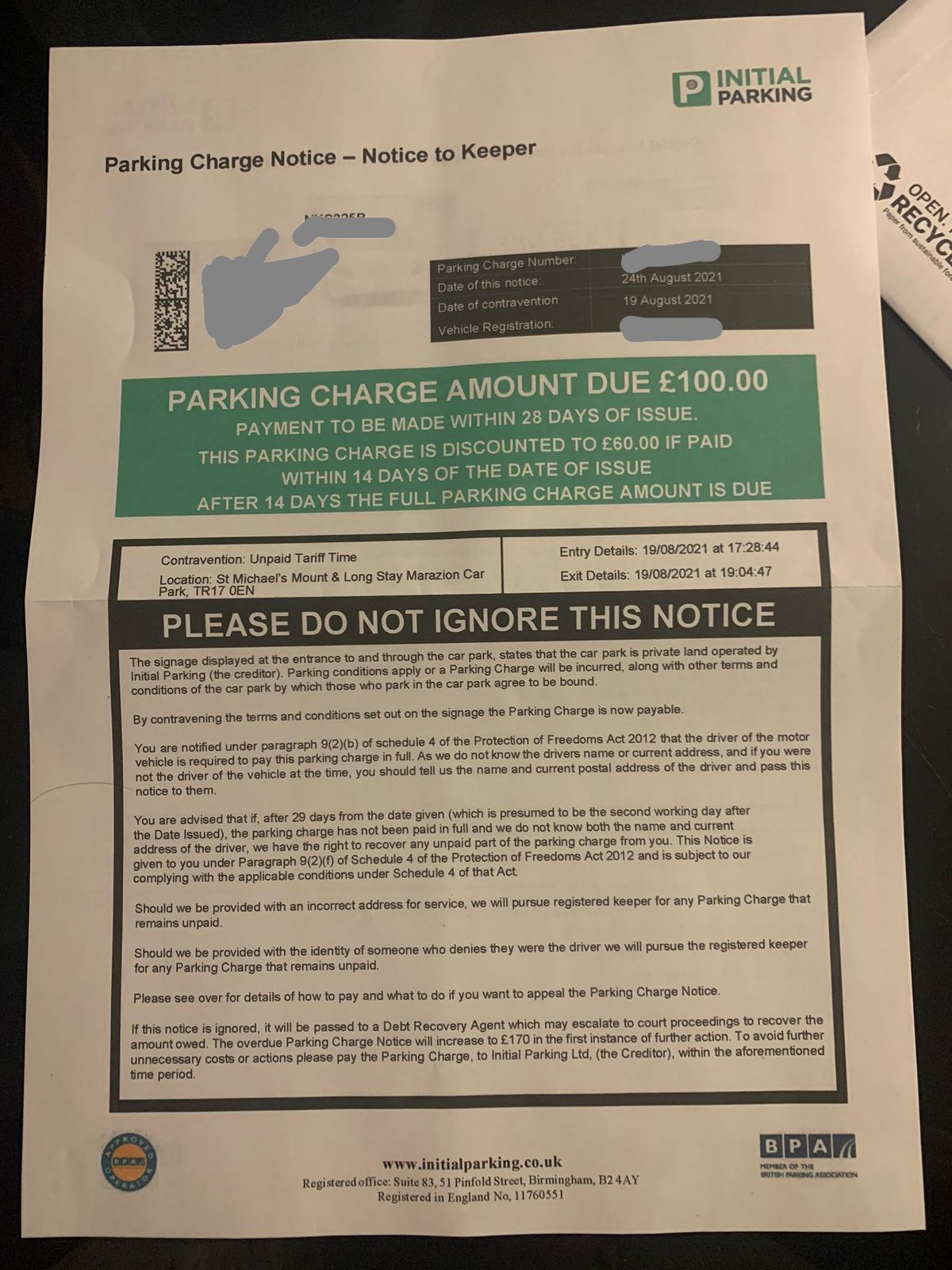 The driver returned home from a staycation to a surprise of a parking fine while stopping at the Marizion carpark in Cornwall, managed by initial parking using ANPR.