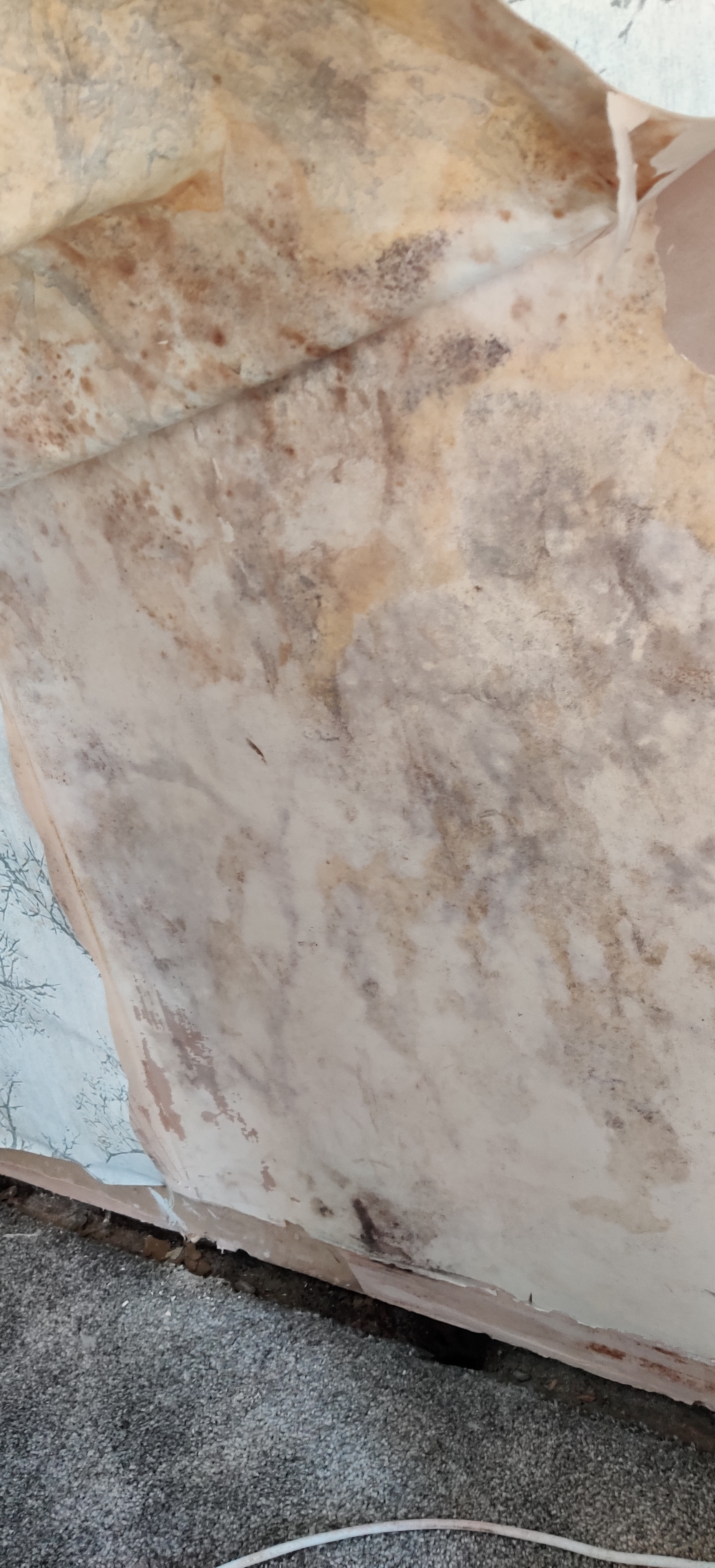 Behind the wall paper it has a cream coloured fur in places but no black marks about a mtr up the wall.