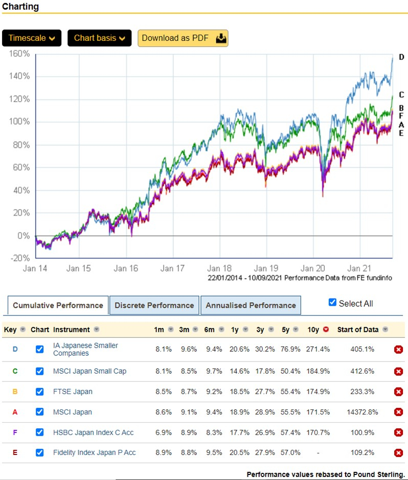 I think you'll find you will get different answers over different historical time periods if comparing Japanese small caps and large caps. I don't think there is a clear case that Japanese small caps consistently outperform large caps, but if you want exposure to them, then a strong case can be made for getting that exposure through an active fund. There are 7 active funds in the sector and they all outperformed the index over 5 years, and all 6 with sufficient data outperformed the index over 10 years; there are 3 investment trusts in the sector with a sufficient track record and again these all outperformed over 5 and 10 years.