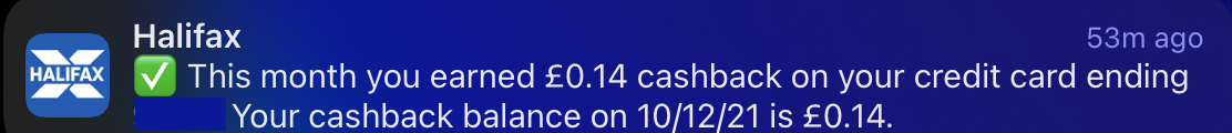 I had a notification for my new Cashback Credit Card this morning but only for the cashback earned so far.