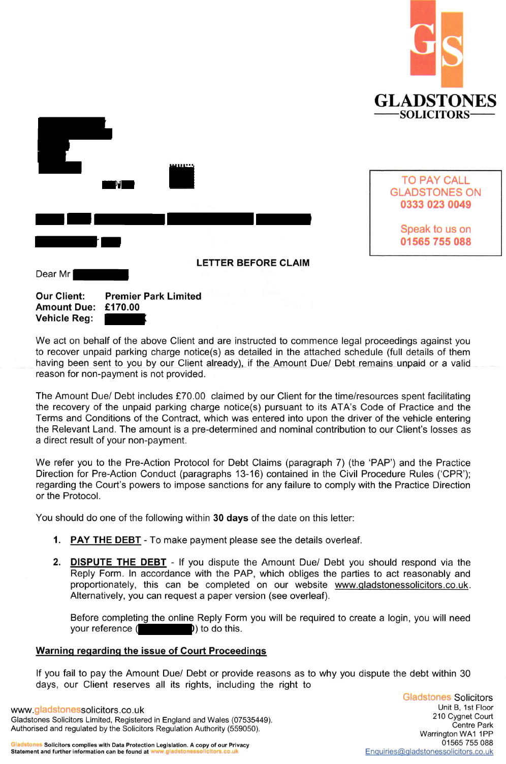 Gladstone are correct , the legal matter is between you and Premier Park ltd , Exeter
