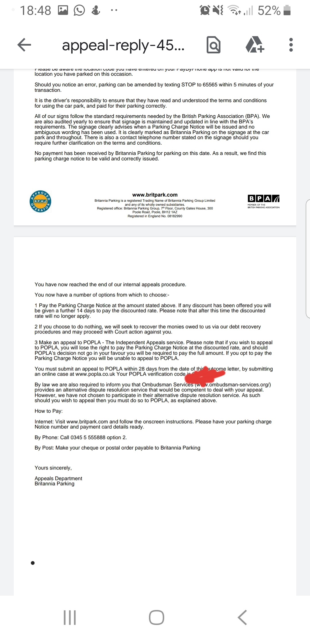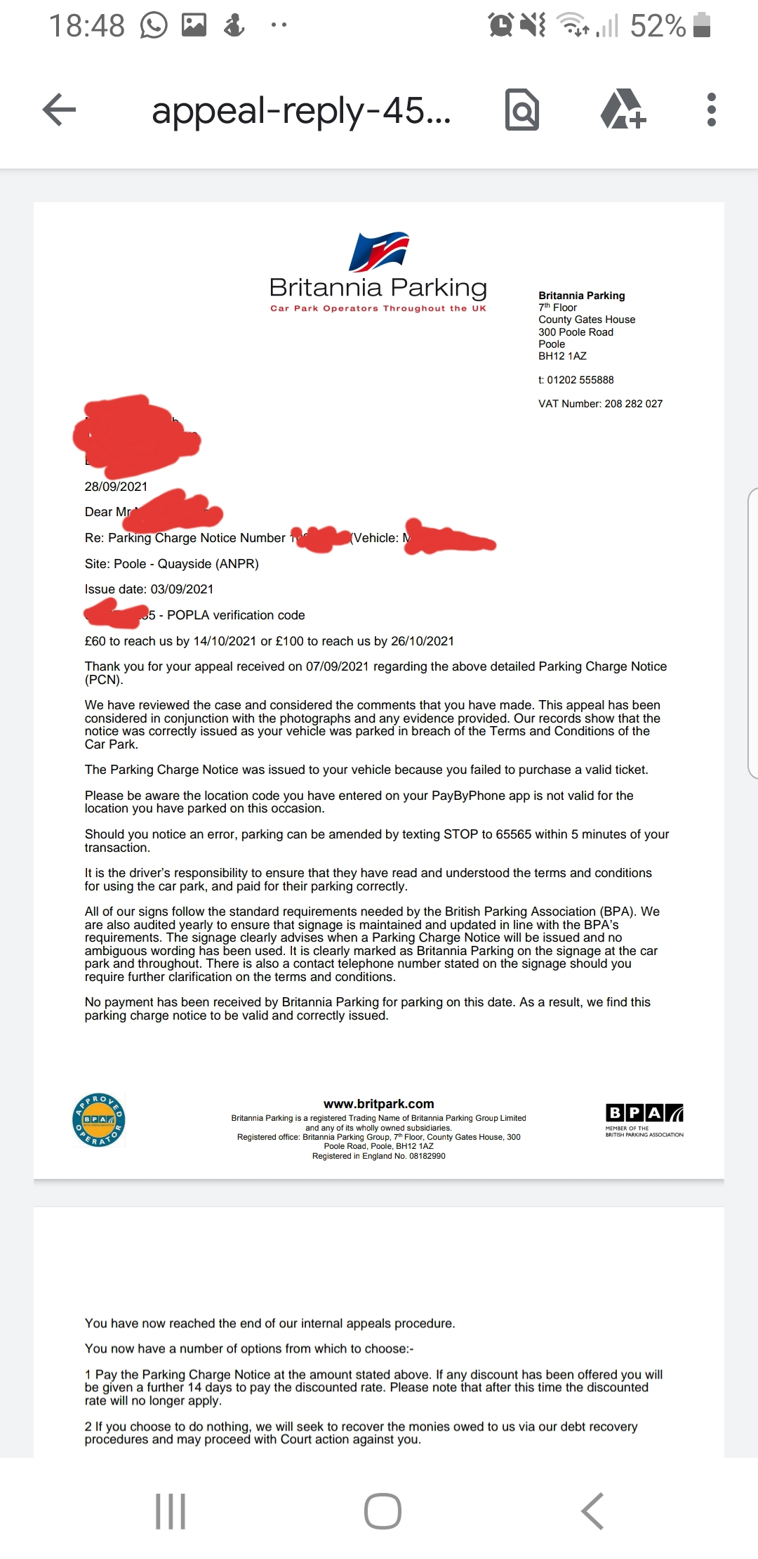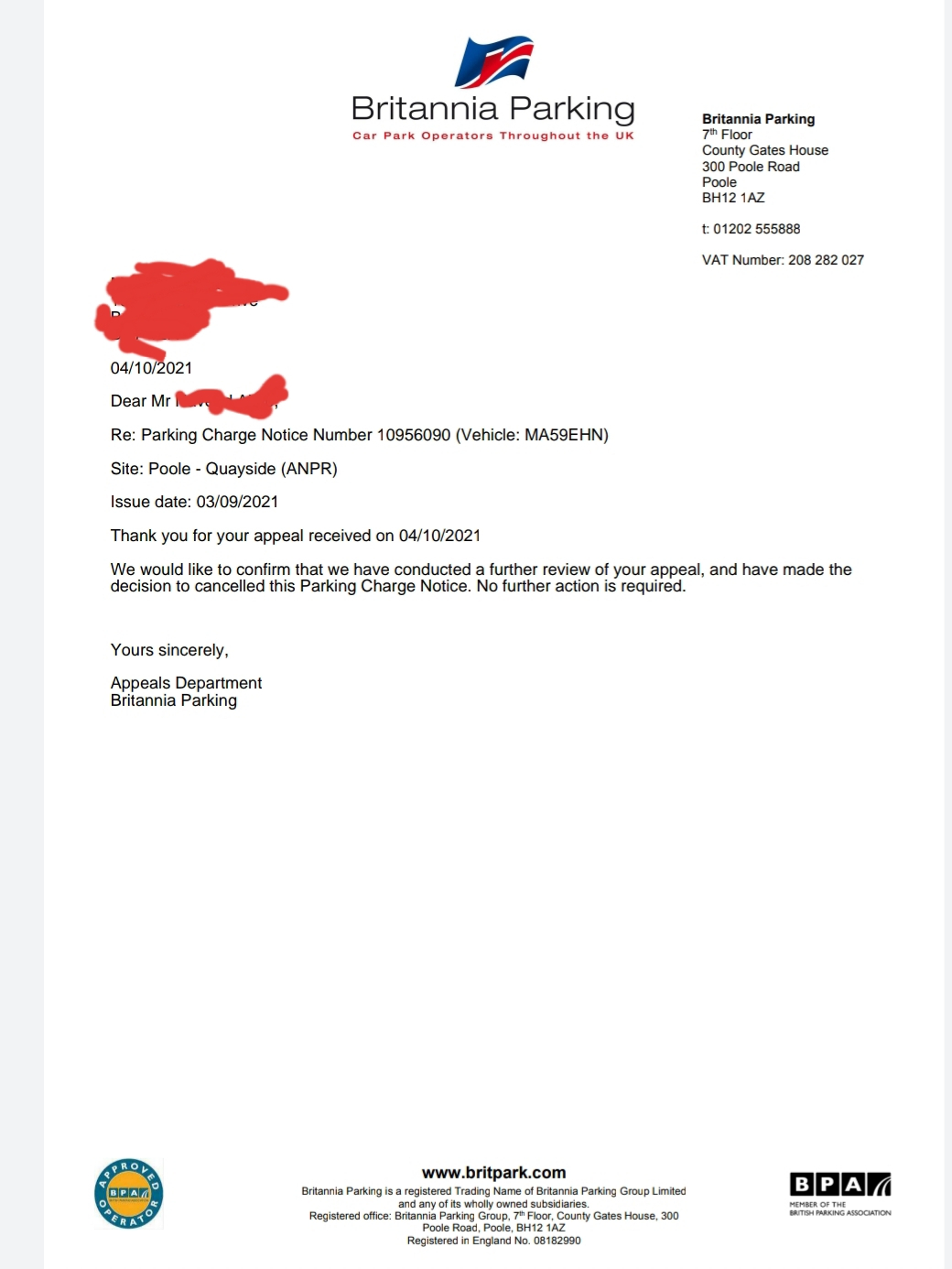 Brittania chickened out.Chickpea5 said:Further to the appeal rejection I have now recieved letter stating PCN has been cancelled. I have come across forums where people say have received similar letters but months down the line still get bailiffs turning up. Hole it is for real cancelled. I had not yet appealed to POPLA but dud appeal to BPA, maybe it could be from that it was re-reviewed. Thanks all for your help.