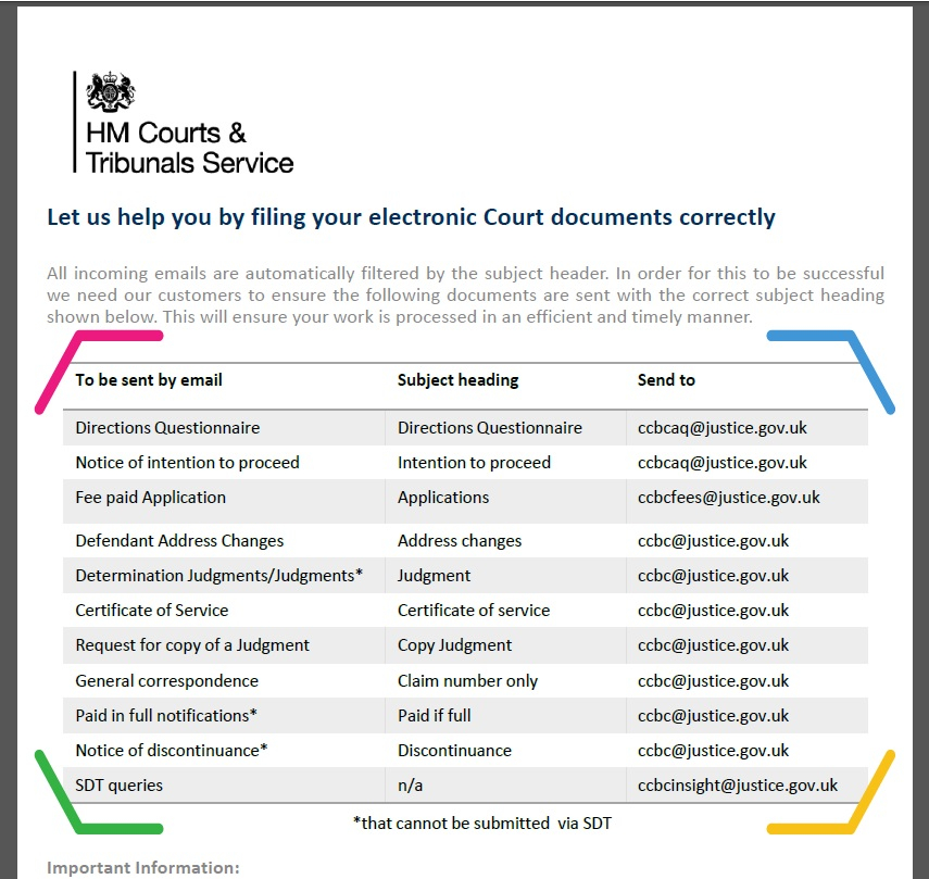 You will need to send any ‘claim response’ which includes the acknowledgment of service, part admission or defence/counterclaim forms as well as directions questionnaires (DQs) directly to ccbcaq@justice.gov.uk to ensure that they are filed correctly. Your email has not been forwarded.