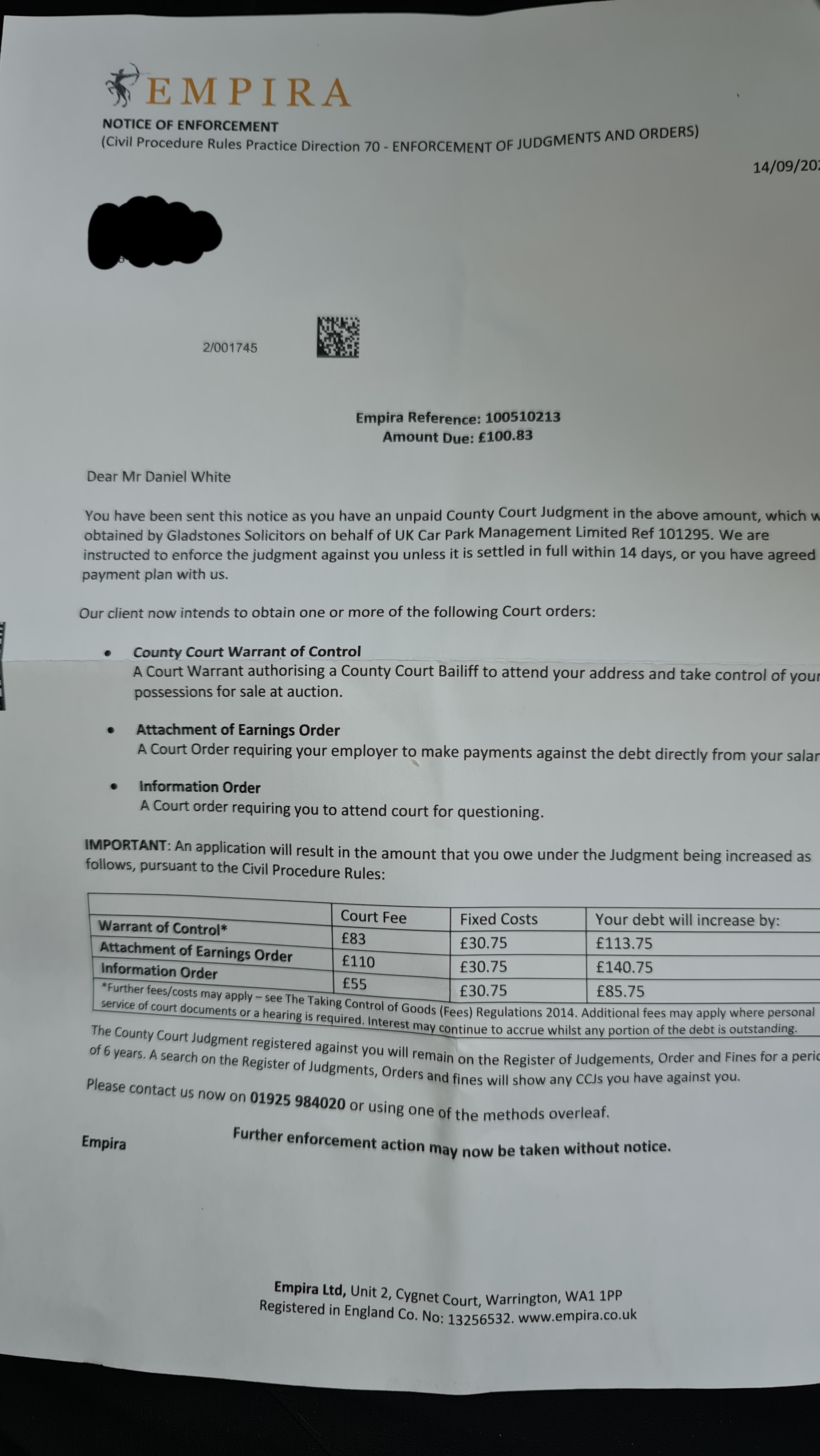 I have received the attached in the post which goes back to an unscrupulous pcn in 2019. I contacted Peter Fisher at Parking Fines Ltd who was originally dealing with it with which I sent all the information to him about. He assured me that it was all being dealt with and I had to do nothing else.
