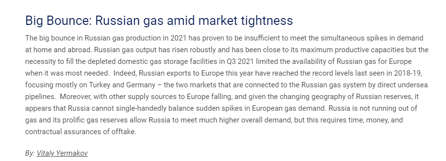 Russian gas output in 2021 has reached the limits of near-term productive capacity