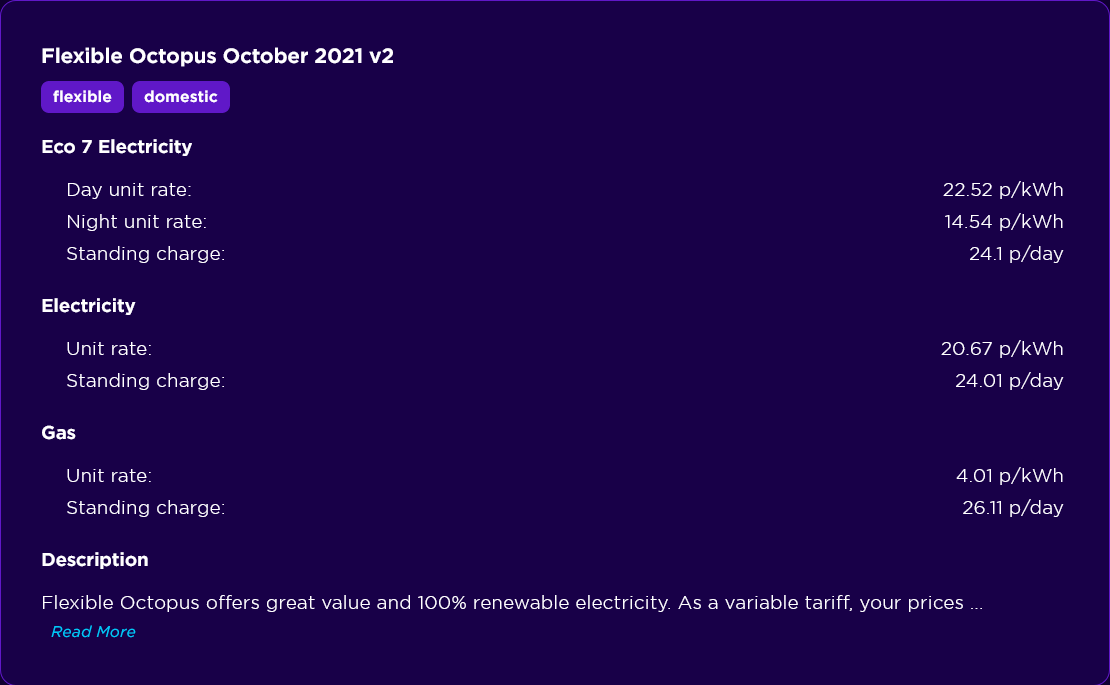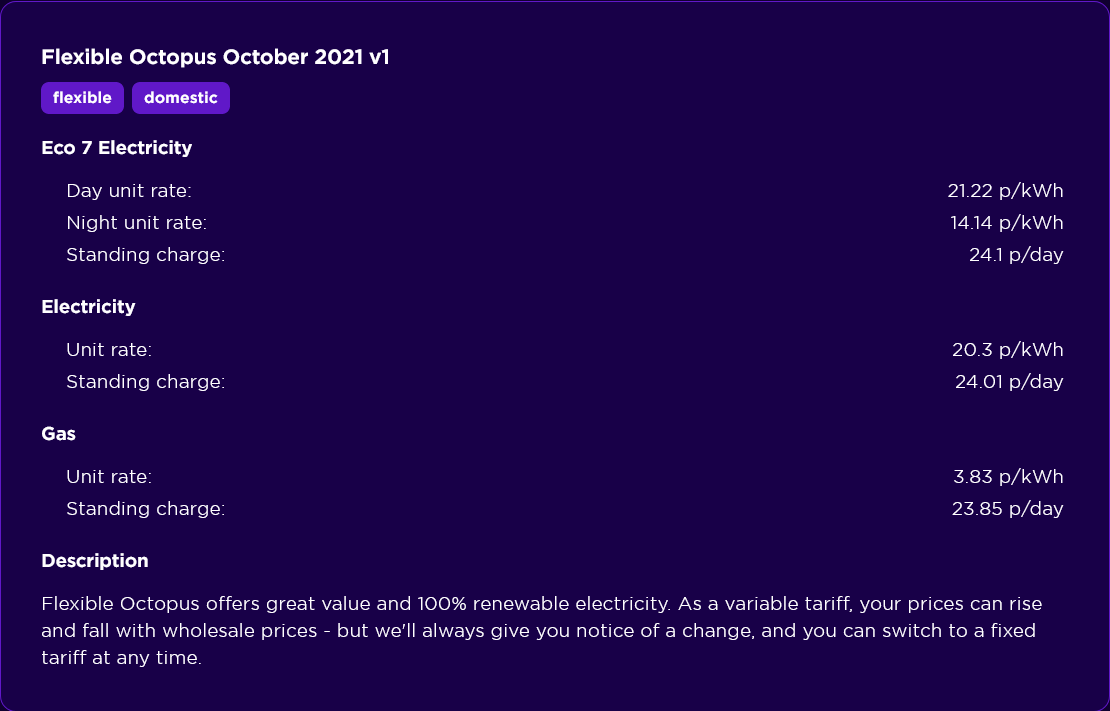 So it isn't hard to get the tariff details from here: https://octopus.energy/tariffs/Don't use the 'Quote' option just scroll down and enter your Post Code.This is the Eastern area for example: