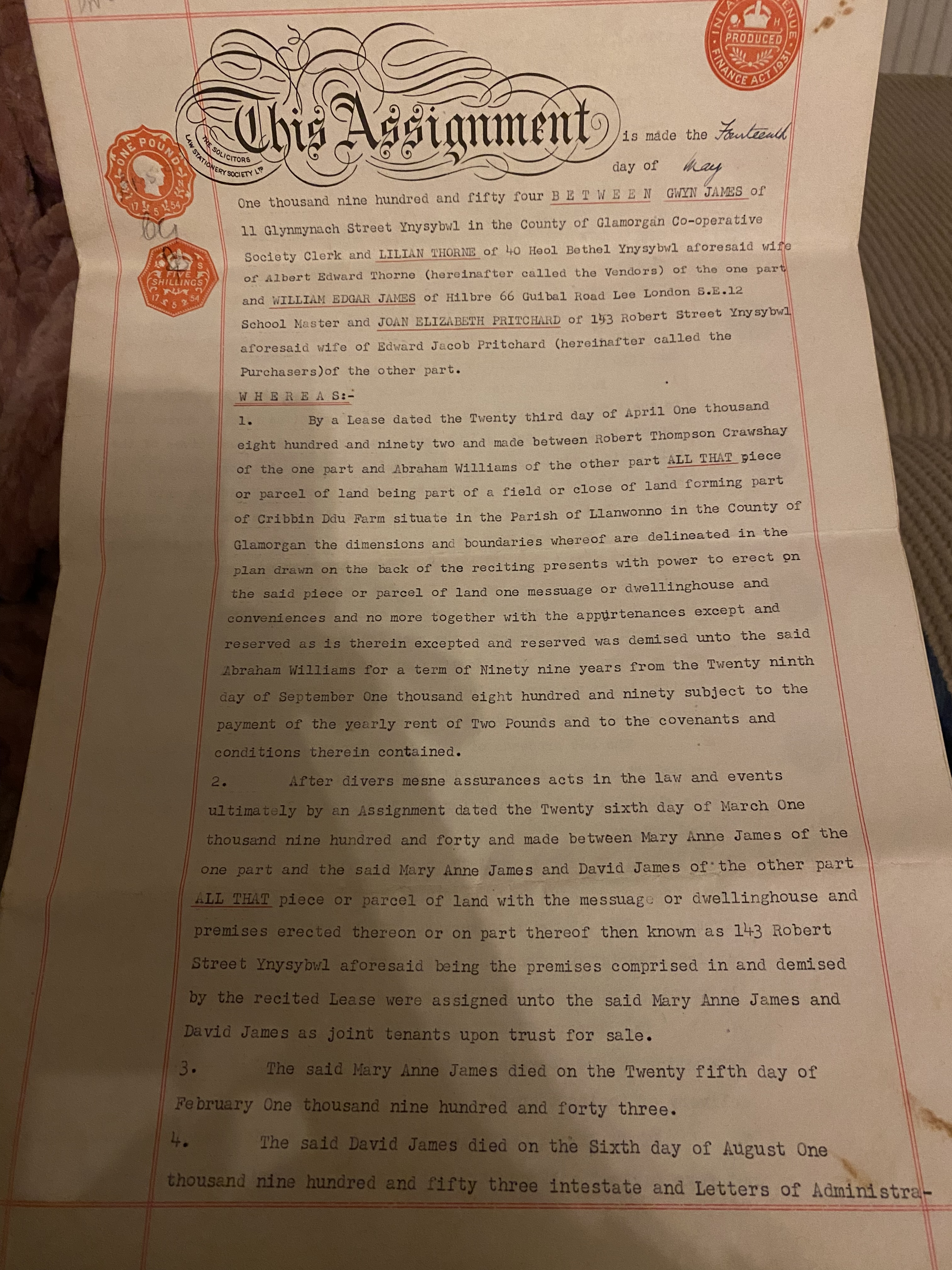 E.g. The 1954 assignment you've posted the first page of is only showing a 'recital' - the section headed "Whereas" - which is explaining the history of how a piece or parcel of land (with rights to erect a house) was demised to someone called Abraham Williams in 1892.