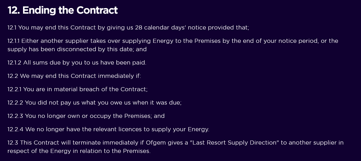 So under 12.2.4 & 12.3 the contract was validly ended and no compensation is due.You could seek to challenge the T&C's of course, but in general it is going to be hard to show that these terms are unfair or unreasonable since the supplier can only make a supply if they hold the required licences.2 -
