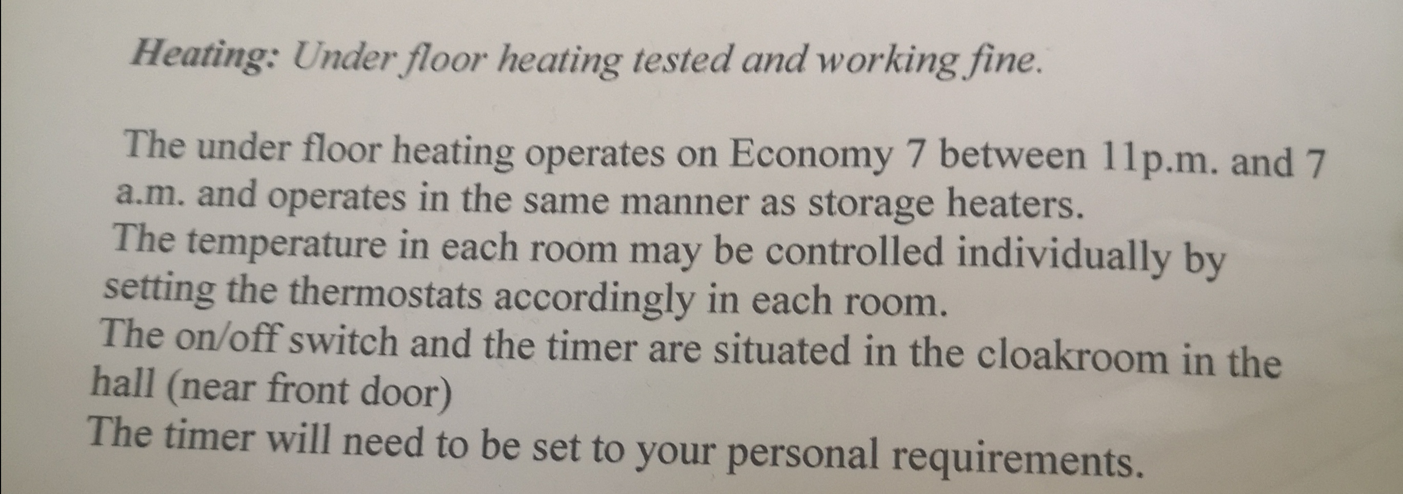 Economy 7 or E7 is an electricity supply tariff that gives you seven hours of cheaper night-time electricity every night (hence "Economy 7") and seventeen hours of more expensive electricity. E7 is typically used with stoorage heaters for heat and electric immersion heaters for hot water, but can be used with almost any electrical appliance (when I had an E7 house I'd put my washing machine on late at night, for example).Your seven hours are from 0030-0730, as stated on the sticker on your electricity meter.Storage heaters use E7 electricity to heat up a pile of bricks in an insulated box, then use vents and (sometimes) fans to allow that heat out during the day. Underfloor heating is generaly meant to run when you need the heat, not to sotre it for future use.I suspect your landlady has never lived in the flat herself and so is telling you what she was told by the salesman. Unfortunately, from what you've said so far it doesn't seem to be accurate.If you owned the flat you could buy and fit a storage heater to make best use of E7. If you're an enthusiastic DIYer (or know one you can bribe with beer & pizza) you could probably do the same with a second-hand storage heater even though you rent.N. Hampshire, he/him. Octopus Intelligent Go elec & Tracker gas / Vodafone BB / iD mobile. Ripple Kirk Hill Coop member.Ofgem cap table, Ofgem cap explainer. Economy 7 cap explainer. Gas vs E7 vs peak elec heating costs, Best kettle!