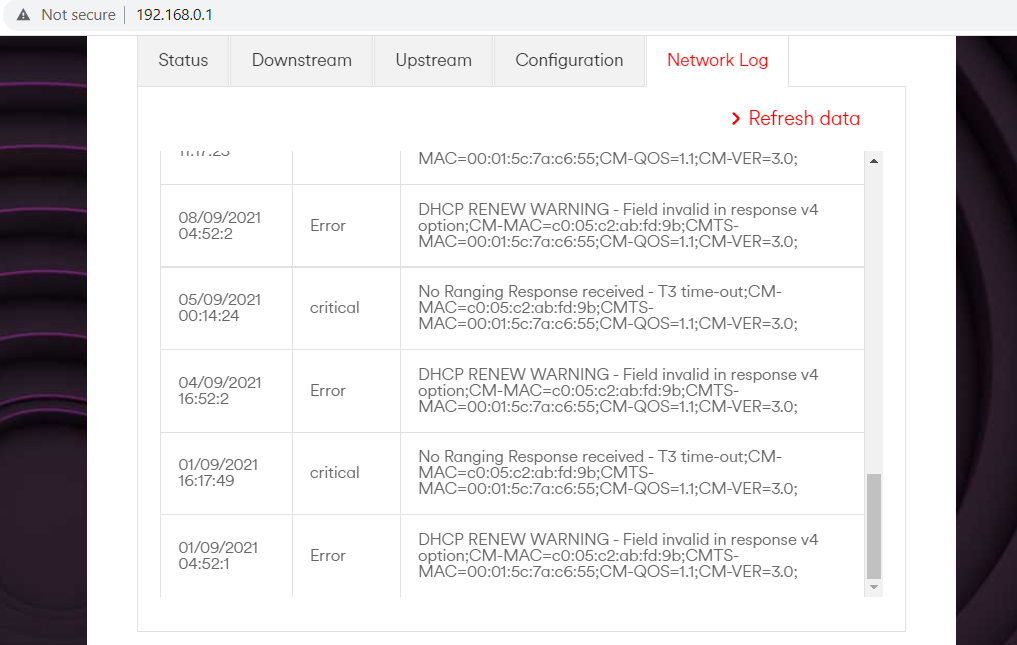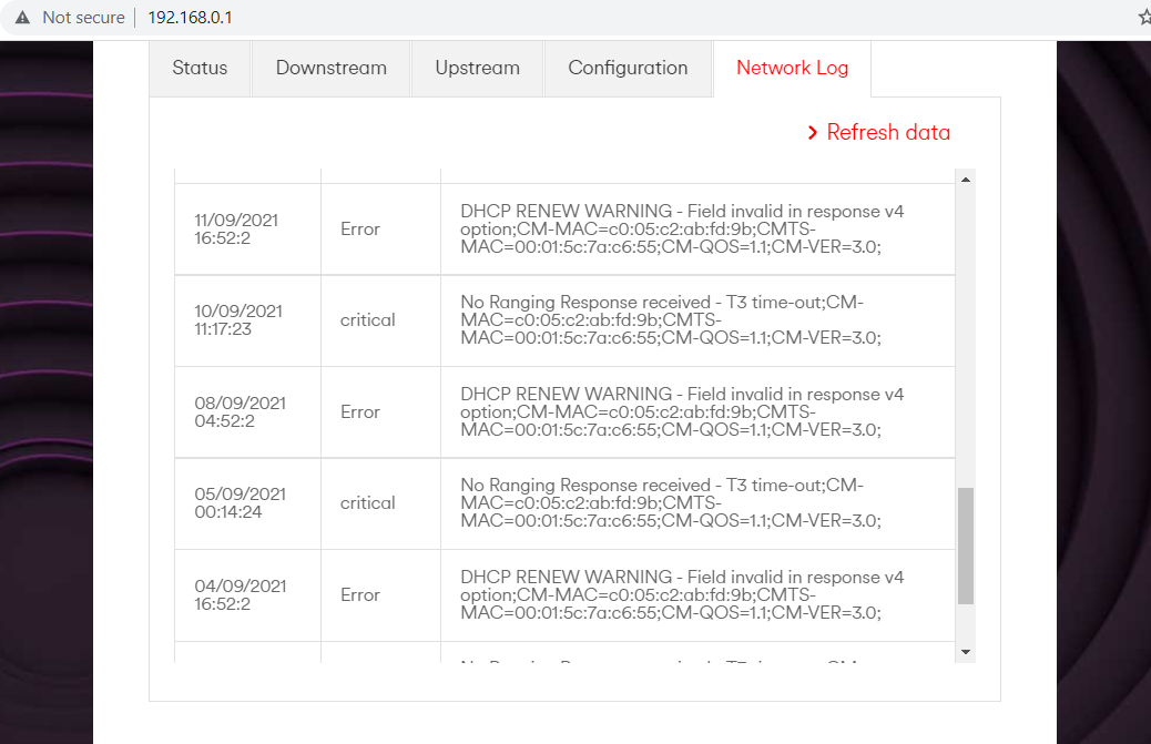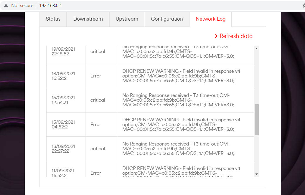 Deleted_User said:RealGem said:FreeBear said:Log in to your hub (192.168.0.1) and have a look at the logs under Advanced Settings->Tools->Network StatusThere may well be some clues there as to why you are getting a poor speed.Last time I was having problems (wired & wifi kept dropping out), I badgered VM for a replacement hub. It took a while to convince them that the problem was with their hardware not mine... But as soon as the new hub was plugged in, the issues disappeared.