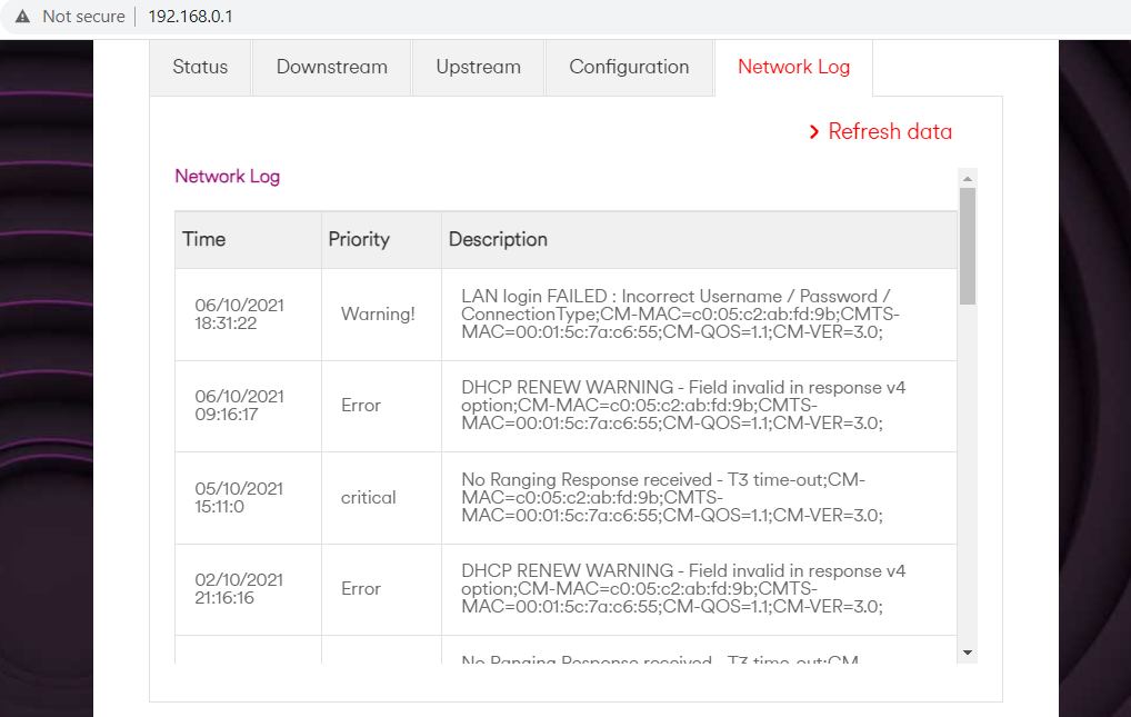 RealGem said:FreeBear said:Log in to your hub (192.168.0.1) and have a look at the logs under Advanced Settings->Tools->Network StatusThere may well be some clues there as to why you are getting a poor speed.Last time I was having problems (wired & wifi kept dropping out), I badgered VM for a replacement hub. It took a while to convince them that the problem was with their hardware not mine... But as soon as the new hub was plugged in, the issues disappeared.