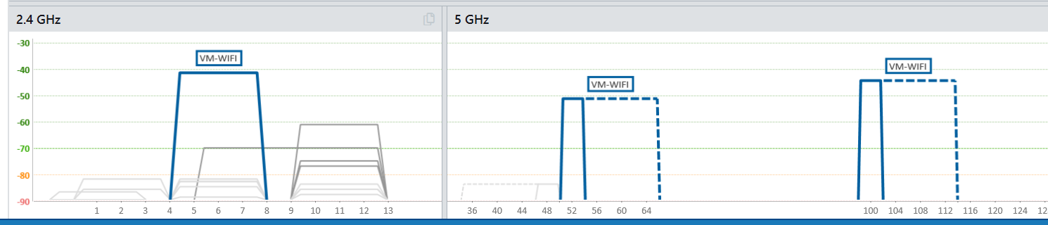 On the other hand, look how clean my 5Ghz spectrum is, my two 80Mhz wide channels in use are totally free of interference, simply because the neighbours 5Ghz won't penetrate as far and doesn't cause interference, only one neighbours 5Ghz is actually visible in my house on channels 36-48 and I can choose to avoid that one.