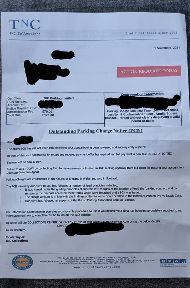 PARKING CHARGE NOTICE FOR FLUTTERING TICKET.