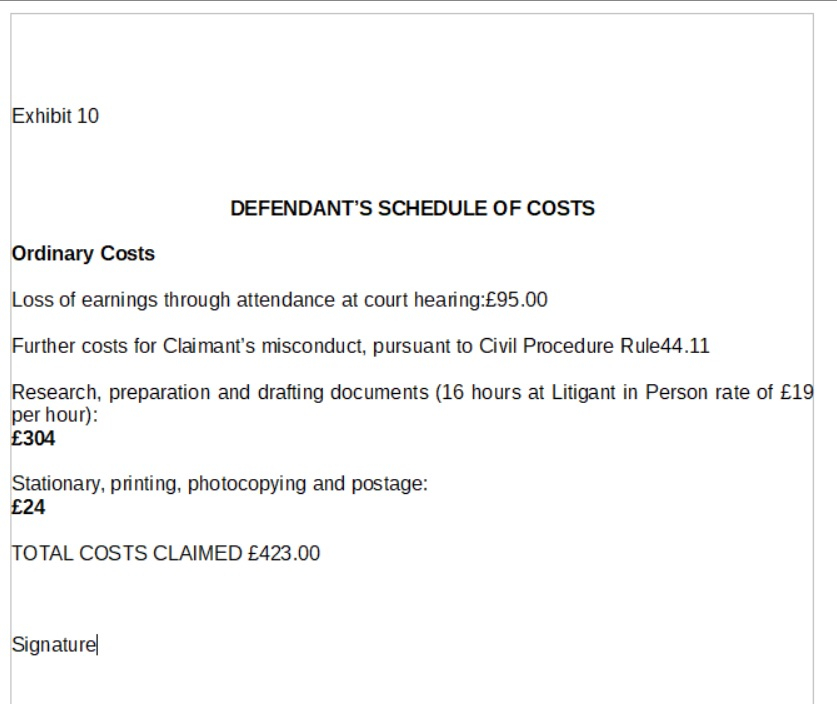 - Therefore, I am appending with this bundle a fully detailed costs assessment, exhibit 10, which covers my proportionate but unavoidable further costs and I invite the court to consider making an award to include these, pursuant to the court's powers in relation to misconduct (CPR 44.11). In support of that argument, I first draw the Court’s attention to the fact that the Claimant was aware that there was no signage at the entrance to the parking area and no signage visible from my vehicle, and that any terms or conditions of parking outlined on any elsewhere-placed signage could not be binding. Such matters, forming a significant part of the Claimant’s business model, can be reasonably considered to be within the Claimant’s expertise, and the Claimant could have avoided this claim.