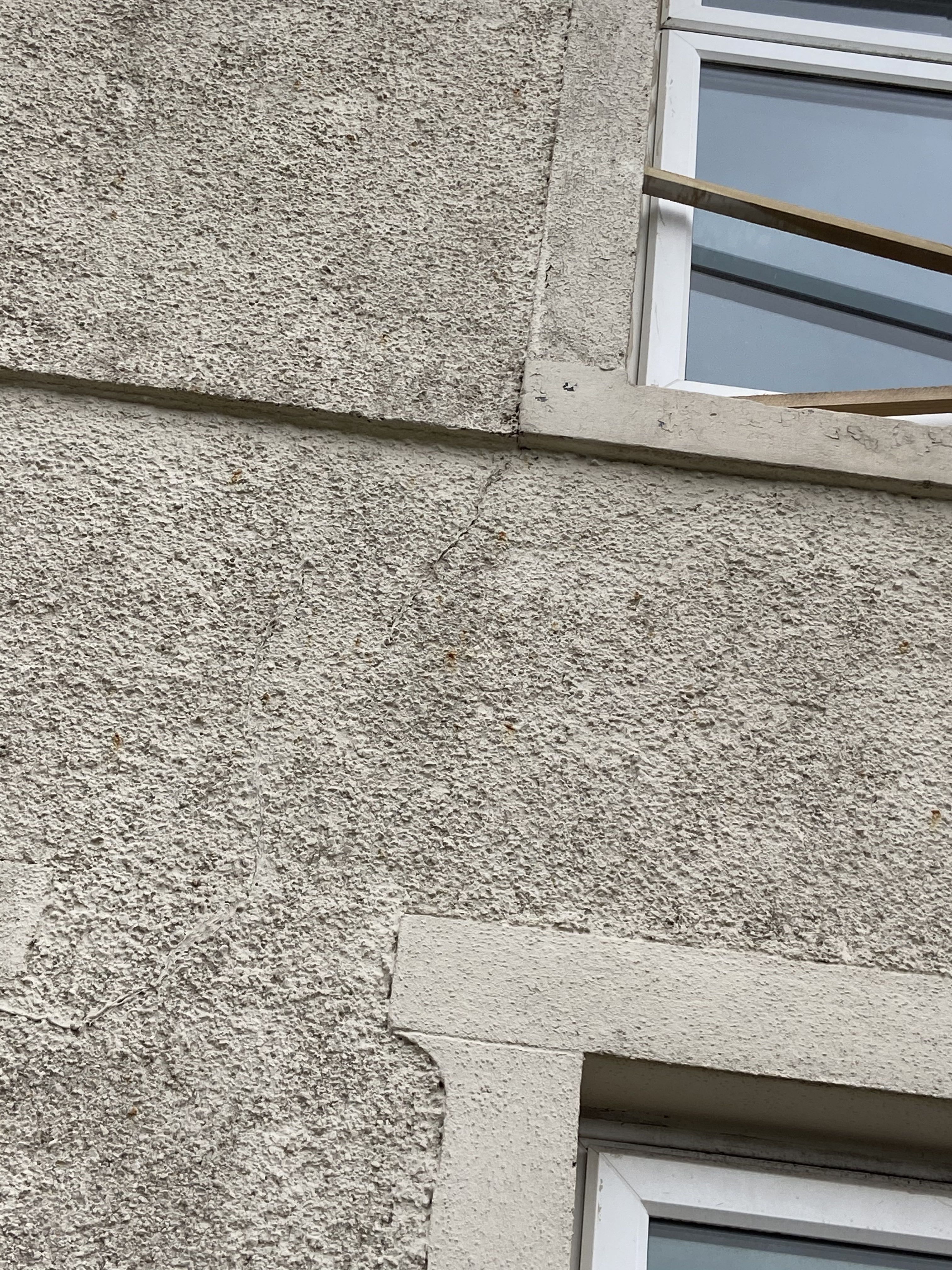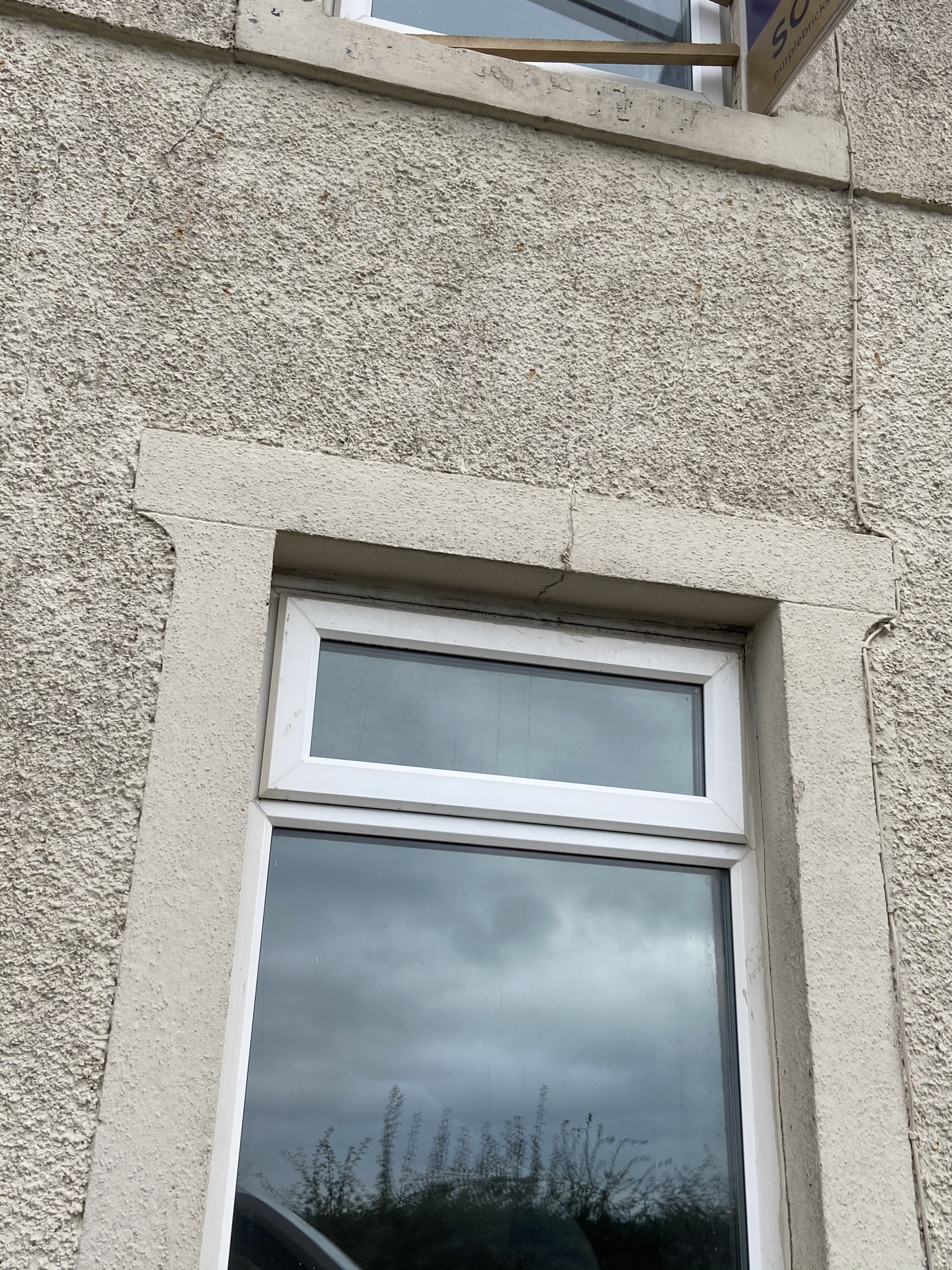 It isn't entirely clear whether the crack above that window is in a lintel, or if the window surround is a pre-cast unit, or if the 'surround' has been created only by the application and shaping of render (e.g. similar to very basic pargeting).