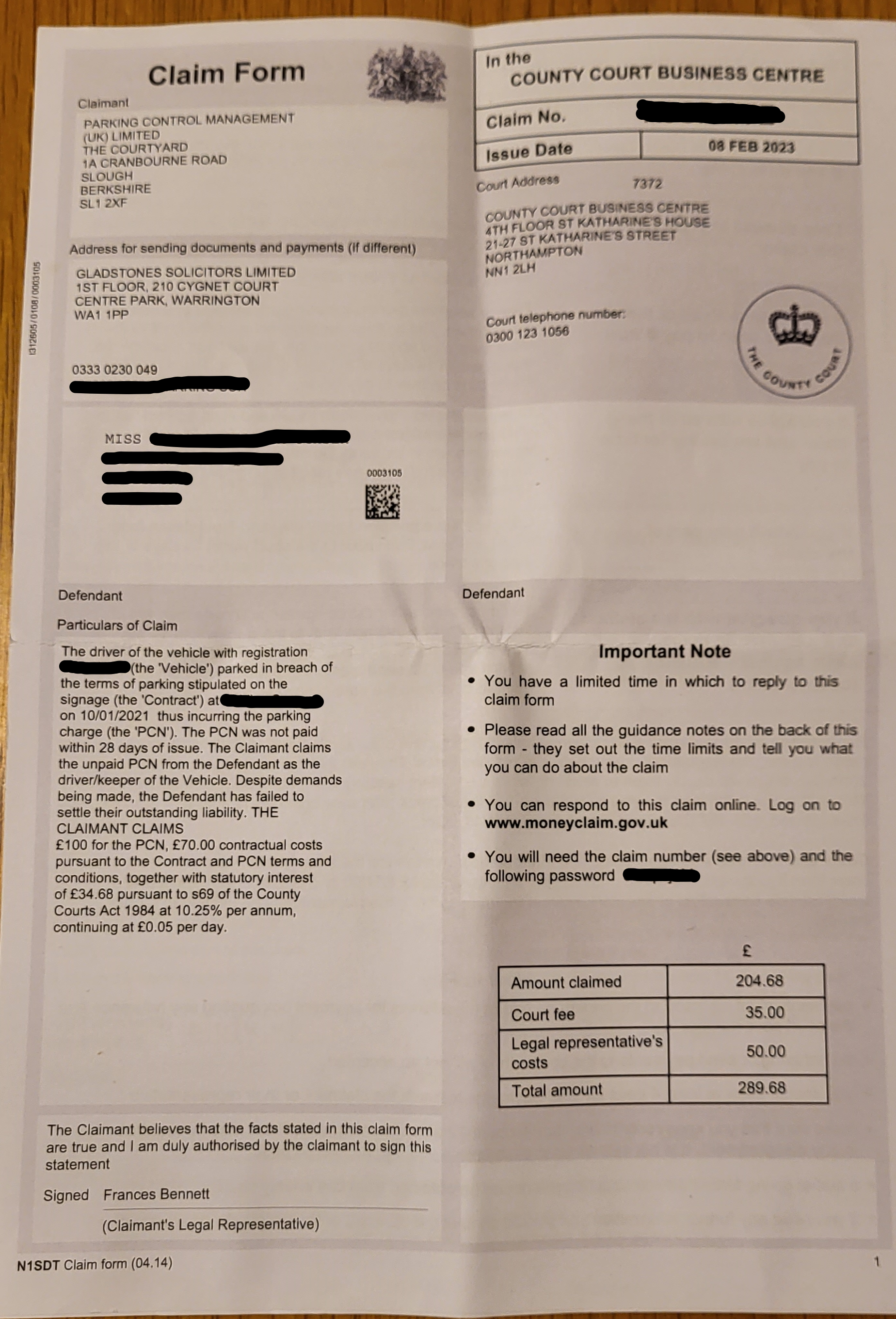 Who at Gladstones signed the claim form bottom left, a paralegal? There may be an extra point to add if it wasn't a solicitor.