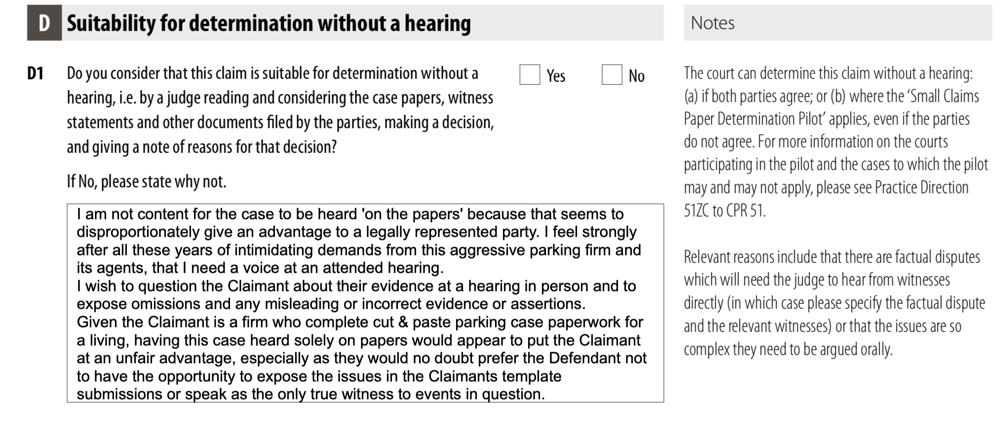 Hello everyone. I finally got my N180 form through the post. Have started filling it in, using this post as a guide: https://forums.moneysavingexpert.com/discussion/comment/71763411#Comment_71763411But I have a few questions if that's okay.1). D1 asks you whether you consider your claim is suitable for determination without a hearing. Should I answer yes or no to this one?2). E1 asks you which county court you would prefer. There is one literally a 5-minute walk away from where I live, but its status is listed as "inactive" on https://courtsdatabase.co.uk , which presumably rules it out (unfortunately). All the other courts I looked at were "active", but had terrible reviews on google. I've got no idea what to look for in a court, so should I just pick the closest one to me geographically and not worry about anything else?3). E5 asks if you believe you are vulnerable in a way which the court needs to consider. I'm tempted to answer yes to this one, citing my autism - I've got an official diagnosis and can provide proof of that if needed. The reason is, it does affect my ability to commumicate, particularly under stress. And this will be stressful. Do you think that's a good idea or would it be better to not say anything?Sorry for all the questions