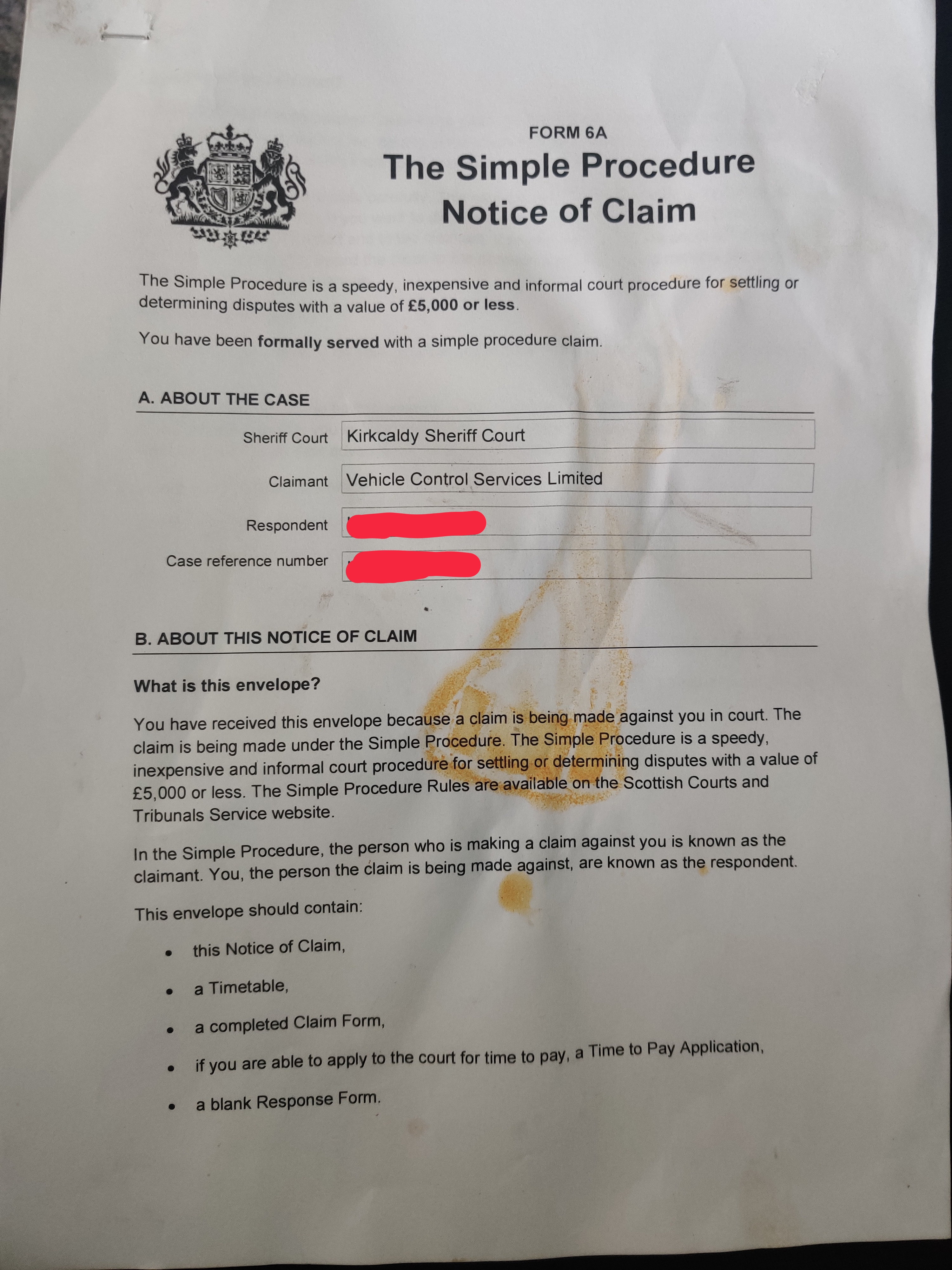 I have now received a 'Simple Procedure Notice Of Claim' from the Sheriff court.