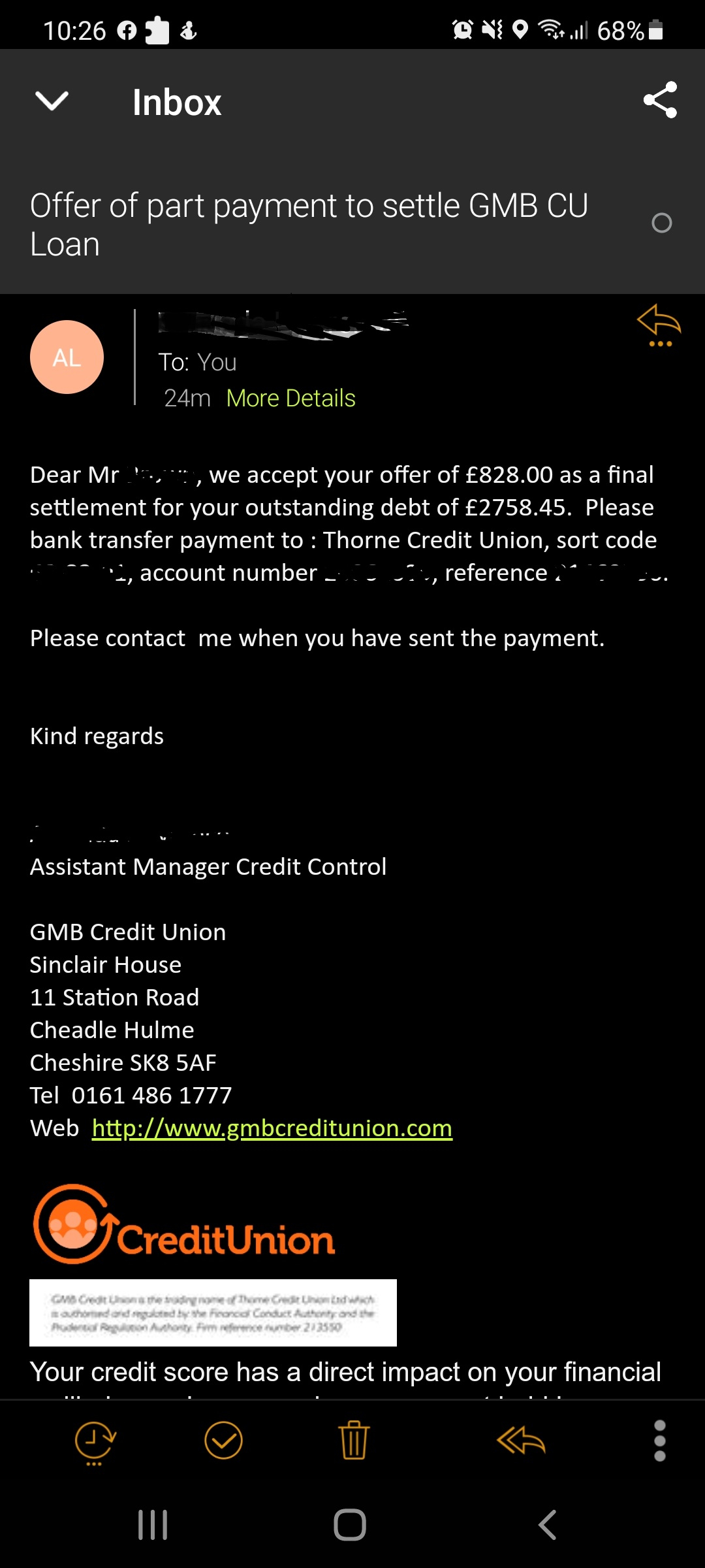 Basically I sent an offer for 30% of my total debts to all creditors yesterday as F&F payments. My biggest creditor emailed me today accepting the offer I made without countering which was a fantastic result. I've attached the email I was sent, removing all personal information.