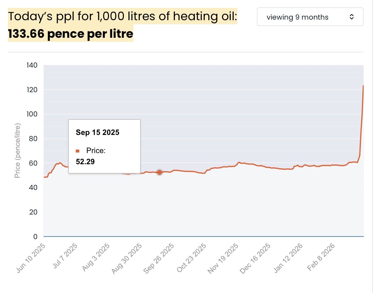 Most of the focus is on gas and electricity price rises but those of us with oil fired central heating are getting hammered already. I paid 50.97 p/litre plus 5% VAT in September. I had a look at current prices and saw this.
