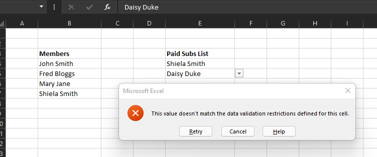 So say you have a list of club members and need to record when each pays their sub. So I need to put "Bob" in a column and have the formula tell me if this is the right name or is he actually listed as Robert. Just need an error message to pop up to prompt me to check rather than think at the end of the year that Robert has never paid.