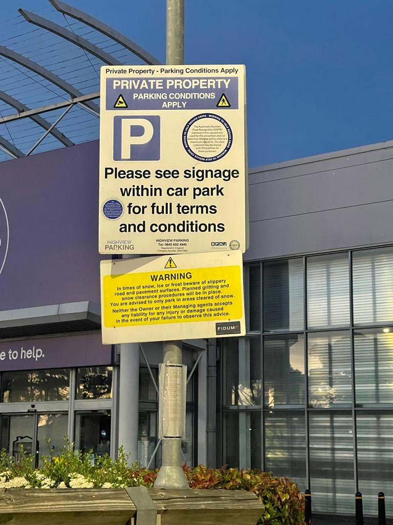 I have picked up that there are only signs on the Mcdonald's side of the car park (Right side) and turning left, where I eventually parked has 0 signs in relation to the contract or explaining the terms.