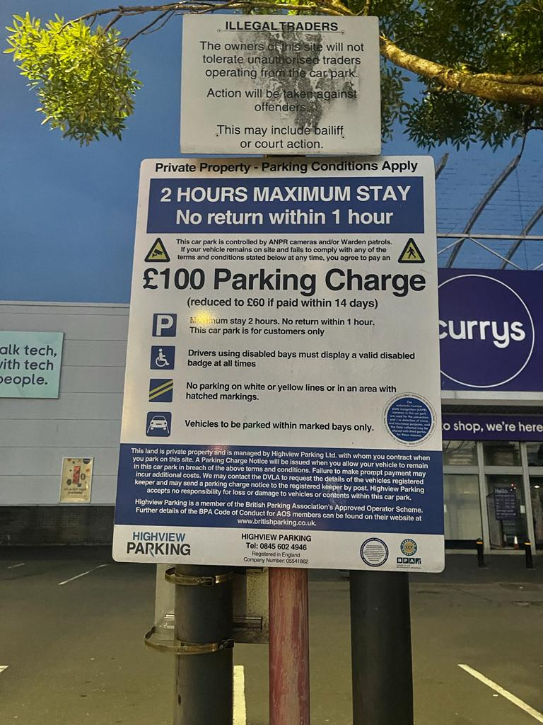 Directly opposite Currys, bear in mind it was dark I do not believe the adequate signs in the car park explain the contract they are holding me against.
