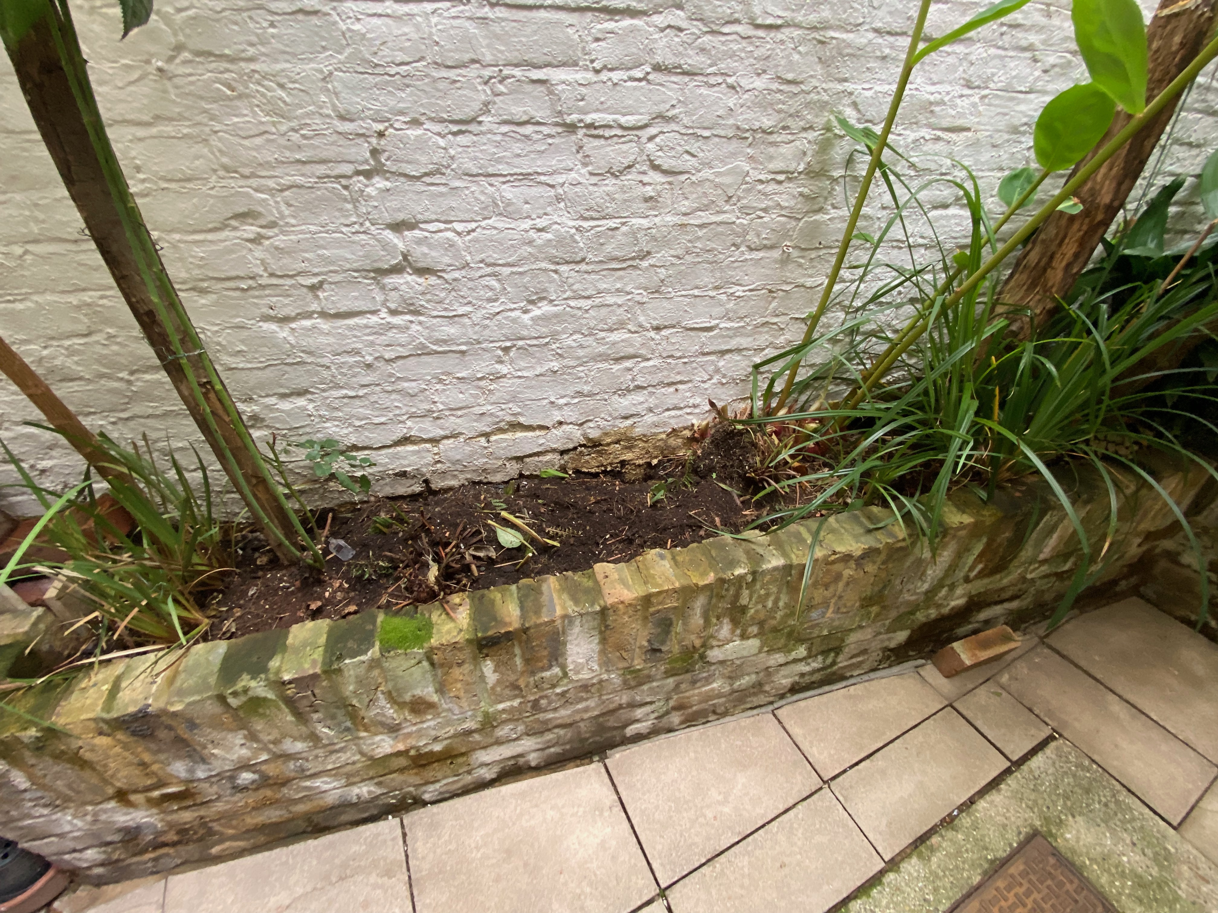 He claims to have repointed the wall (!) before painting it and doesn't believe the planter is doing any damage. However, it's easy to see that the wall is being badly affected by the planter and in particular by the large plant on the right.