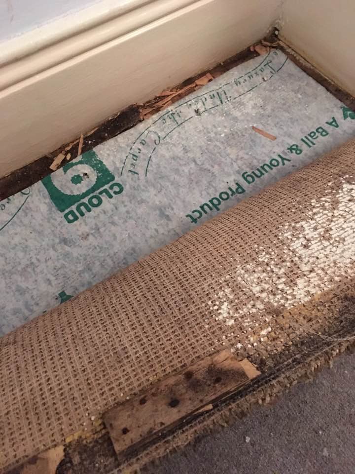 The vendor rang me a few times before completion, and told me on the telephone that she had 'overwatered' a plant in this area. When I moved in she'd put a piece of spare carpet over it and I've been so busy I didn't investigate. A few months ago my cat's basket and blanket became mouldy in this area but I felt the carpet and it was dry, and forgot about it.